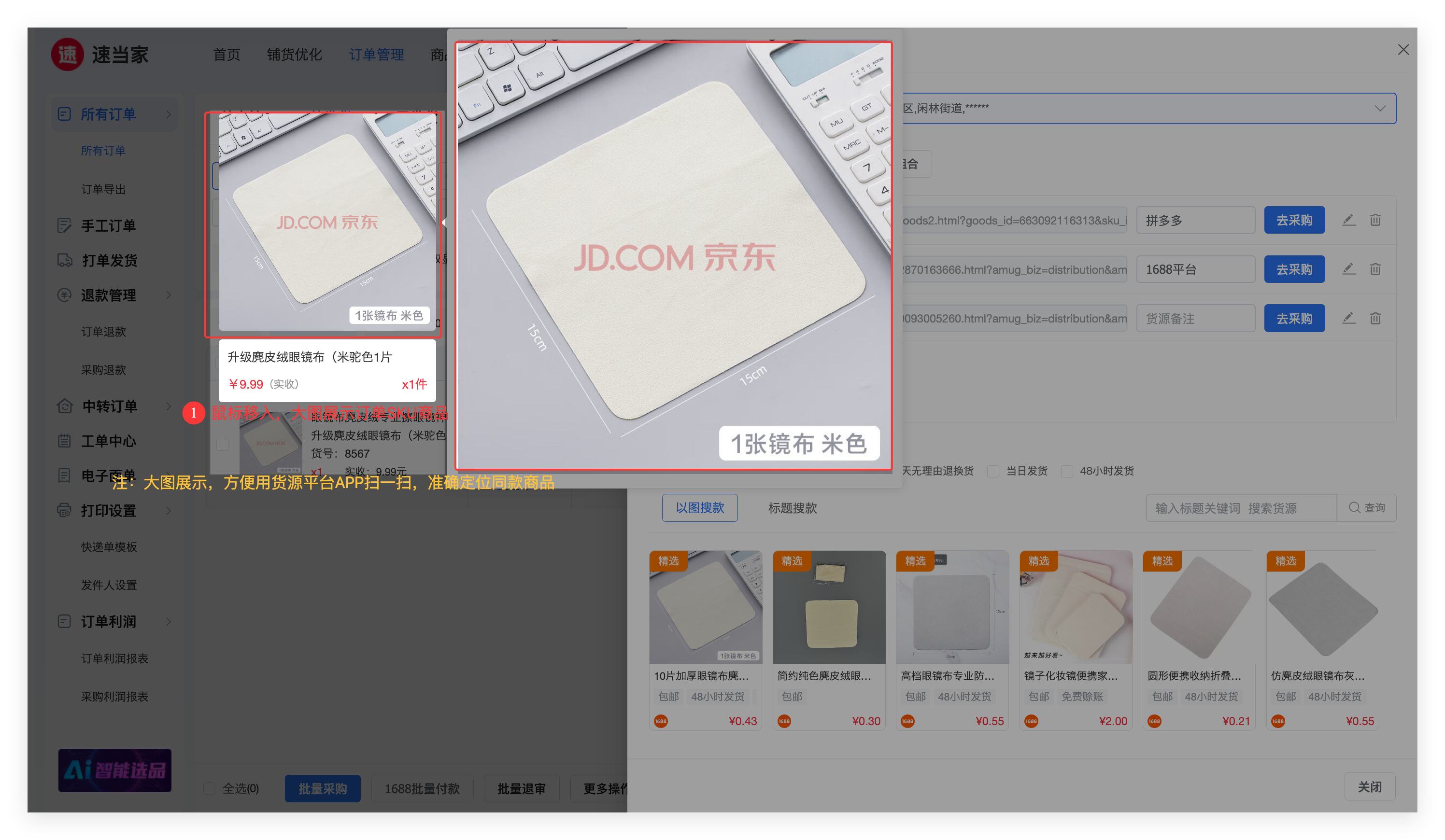 扫图寻源:大图展示订单中的 SKU 商品,商家只需用货源平台APP,对准商品图扫一扫,即可定位同款商品。
