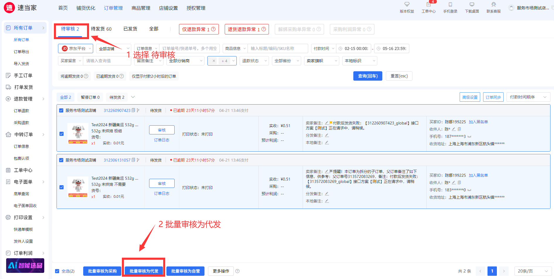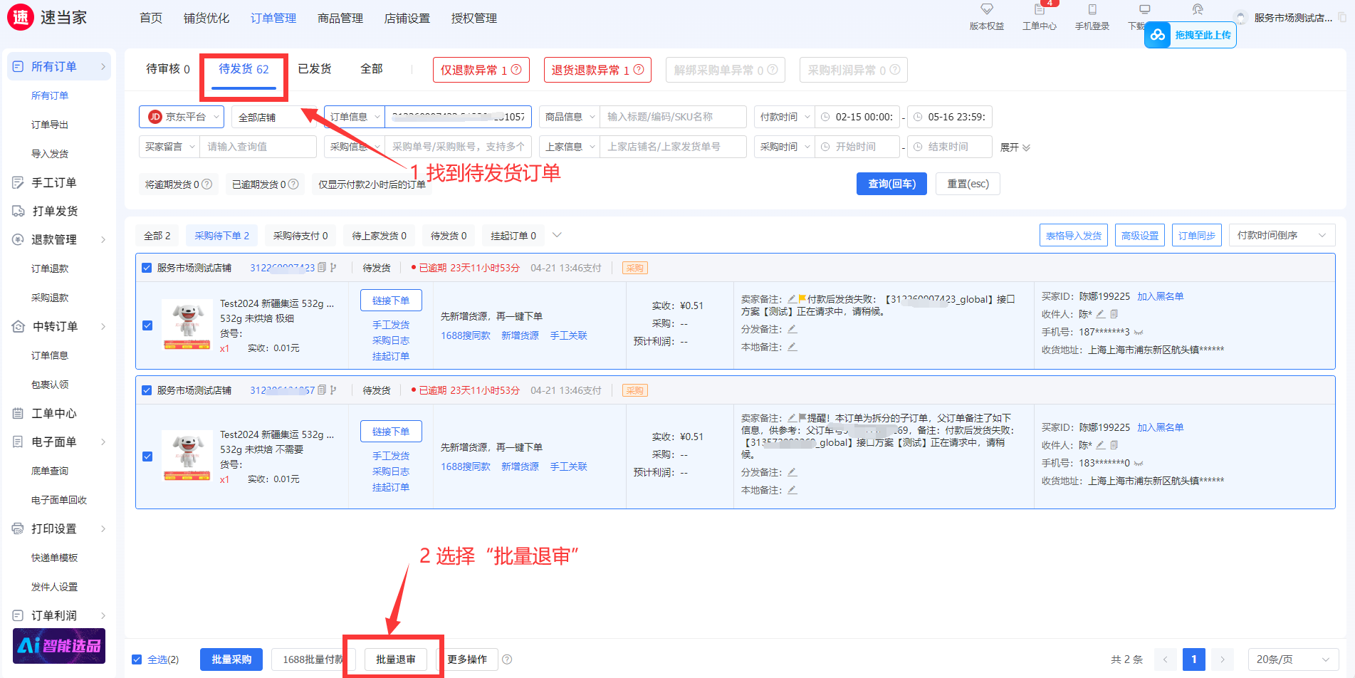 2.1 分销商系统默认审核为采购,如果需要供应商代发,在所有订单页-待发货-选择退审,再审核为代发。
