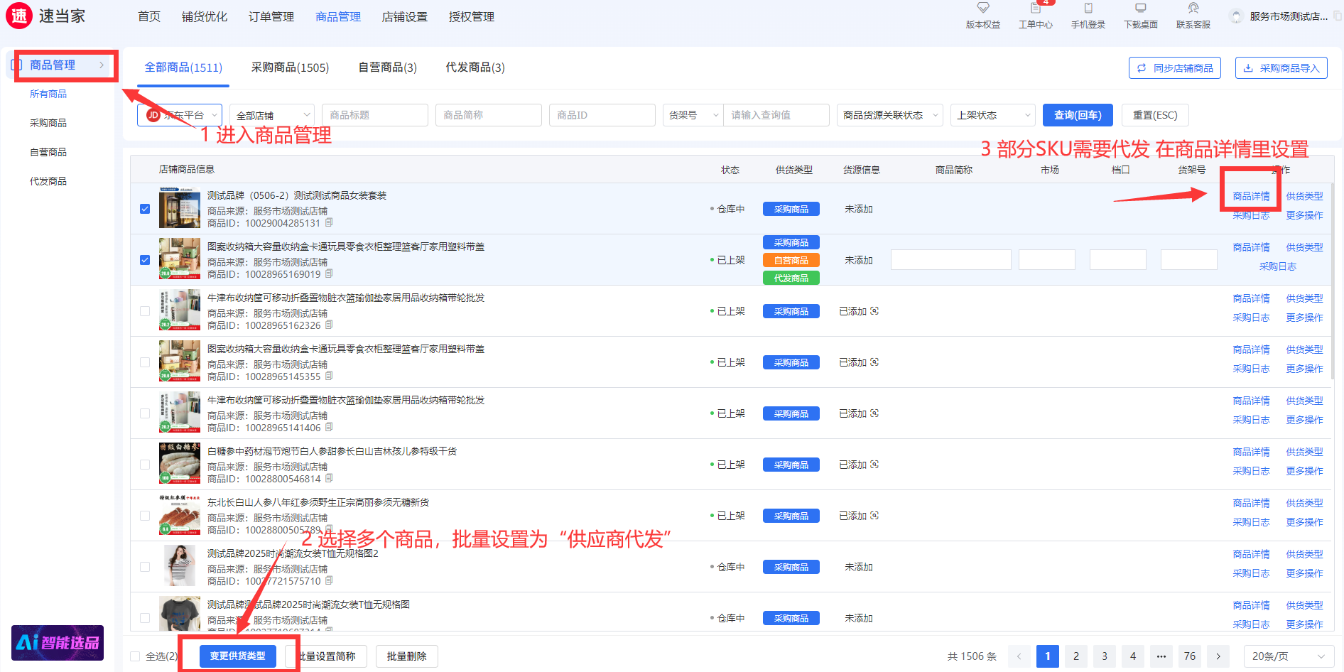 2.2 如果还有其他商品需要供应商代发,可前往商品管理页,选择商品变更供货类型设置,此后新订单会按照新设置的供货类型自动审核订单。