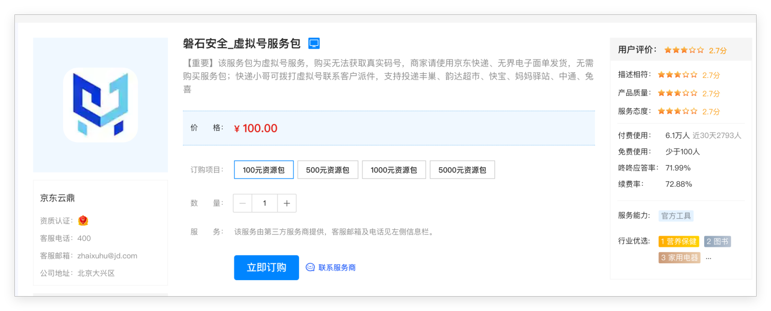 点击 磐石安全_虚拟号服务包 购买,该服务为京东官方提供的收费服务,如遇到虚拟号问题需咨询京东客服。