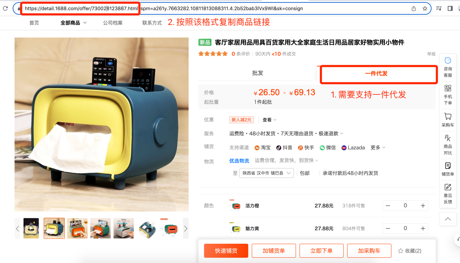 第一步:登录1688,选择支持一件代发的分销商品,复制商品链接