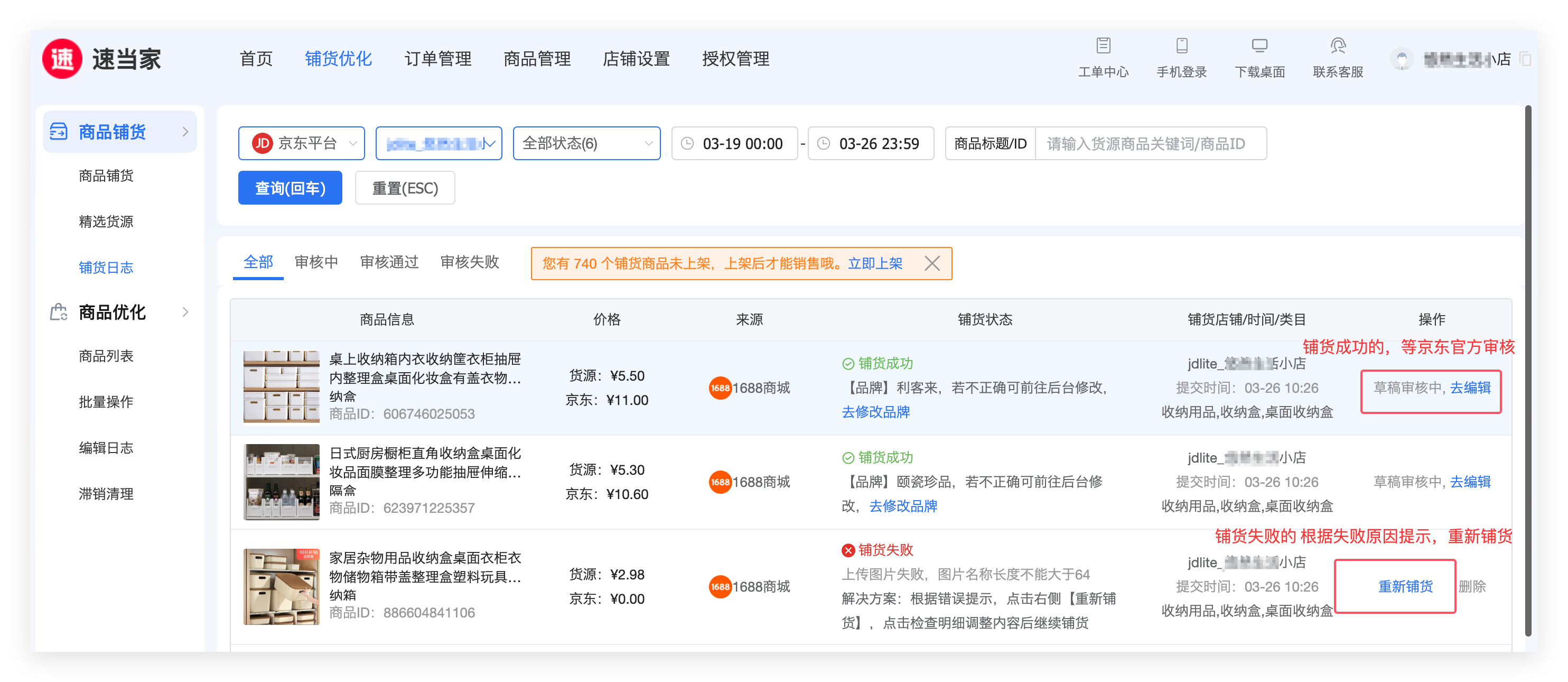 第四步:在【铺货日志】中可查看铺货成功、铺货失败的商品