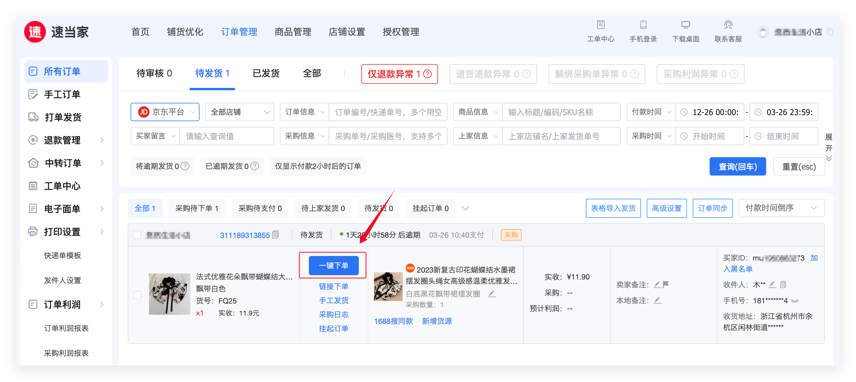 第一步:点击【一键下单】快速向1688供应商采购