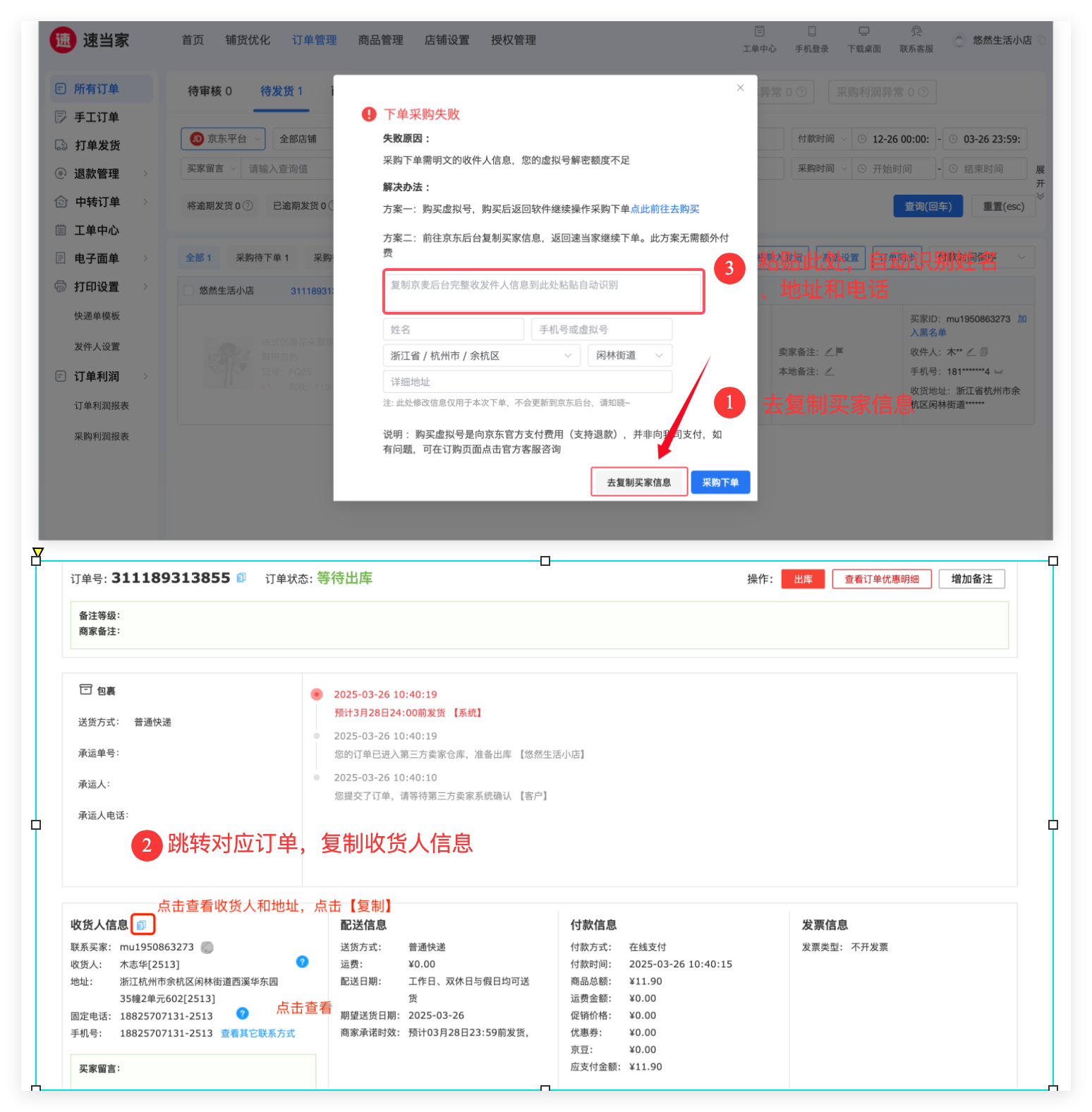 由于京东数据加密,采购时需要解密买家手机号信息,点击下方【复制买家手机号】可跳转京东后台复制该订单的买家收件人信息,填写到输入框中。