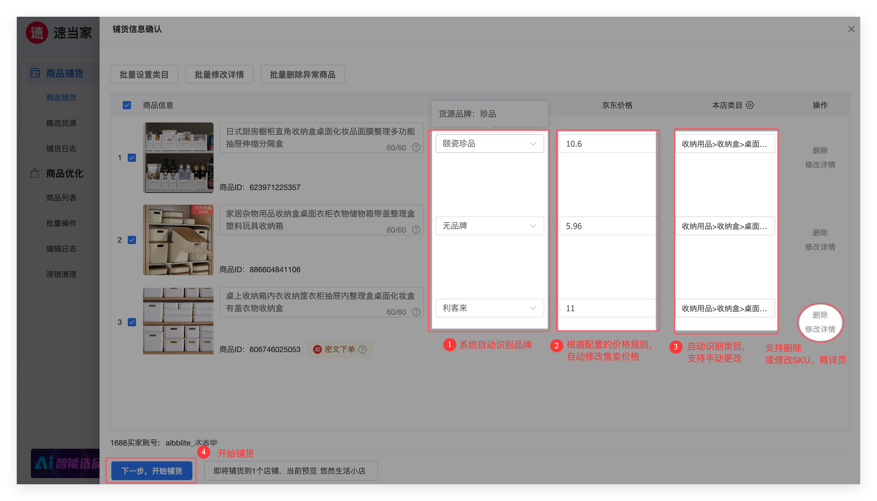 第三步:系统自动匹配类目,自动修改价格,点击【下一步开始铺货】