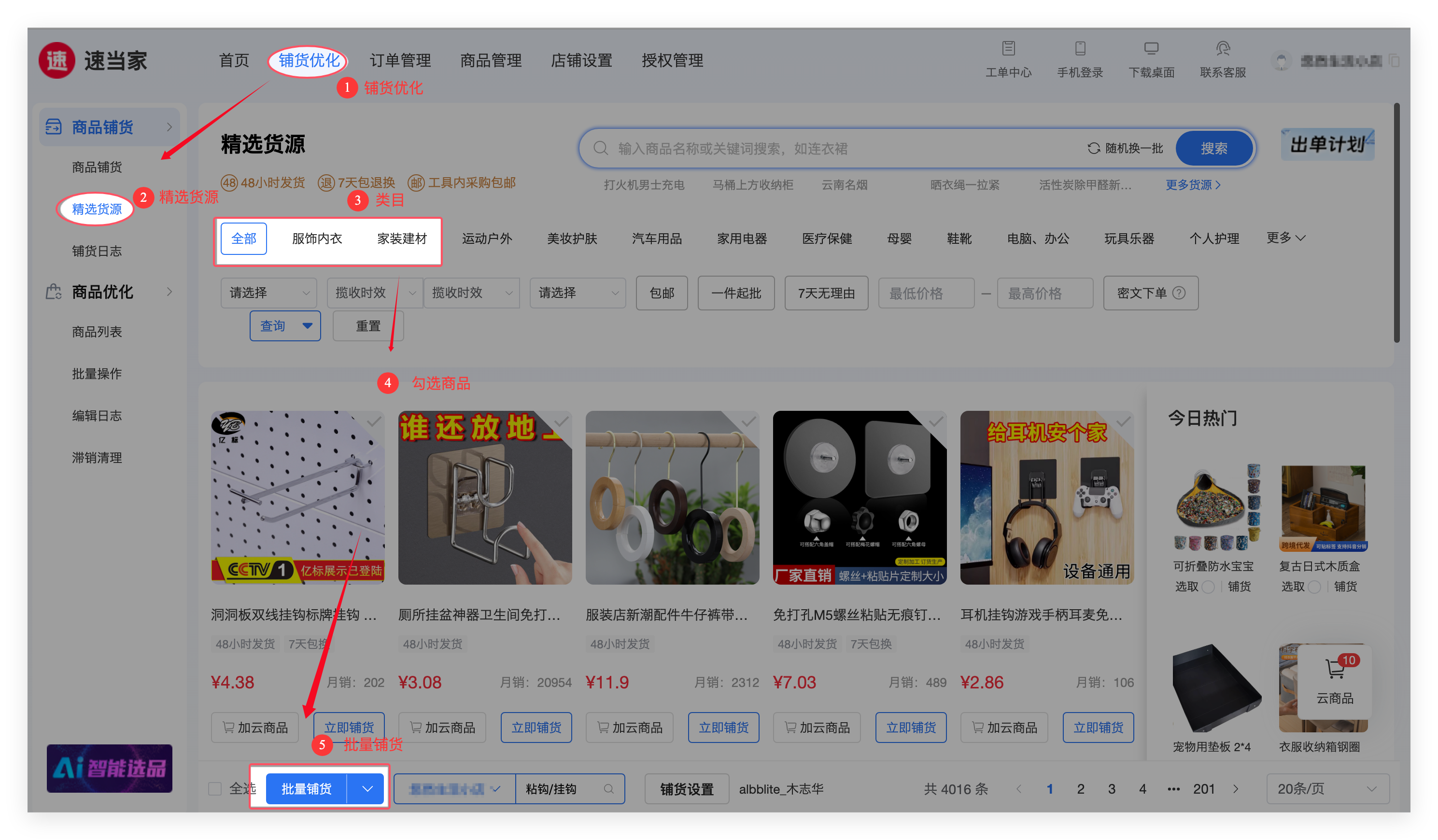 如果您不懂得如何在1688官网选品,可直接通过速当家【精选货源】选品上货,海量官方免授权货源,一键铺货。