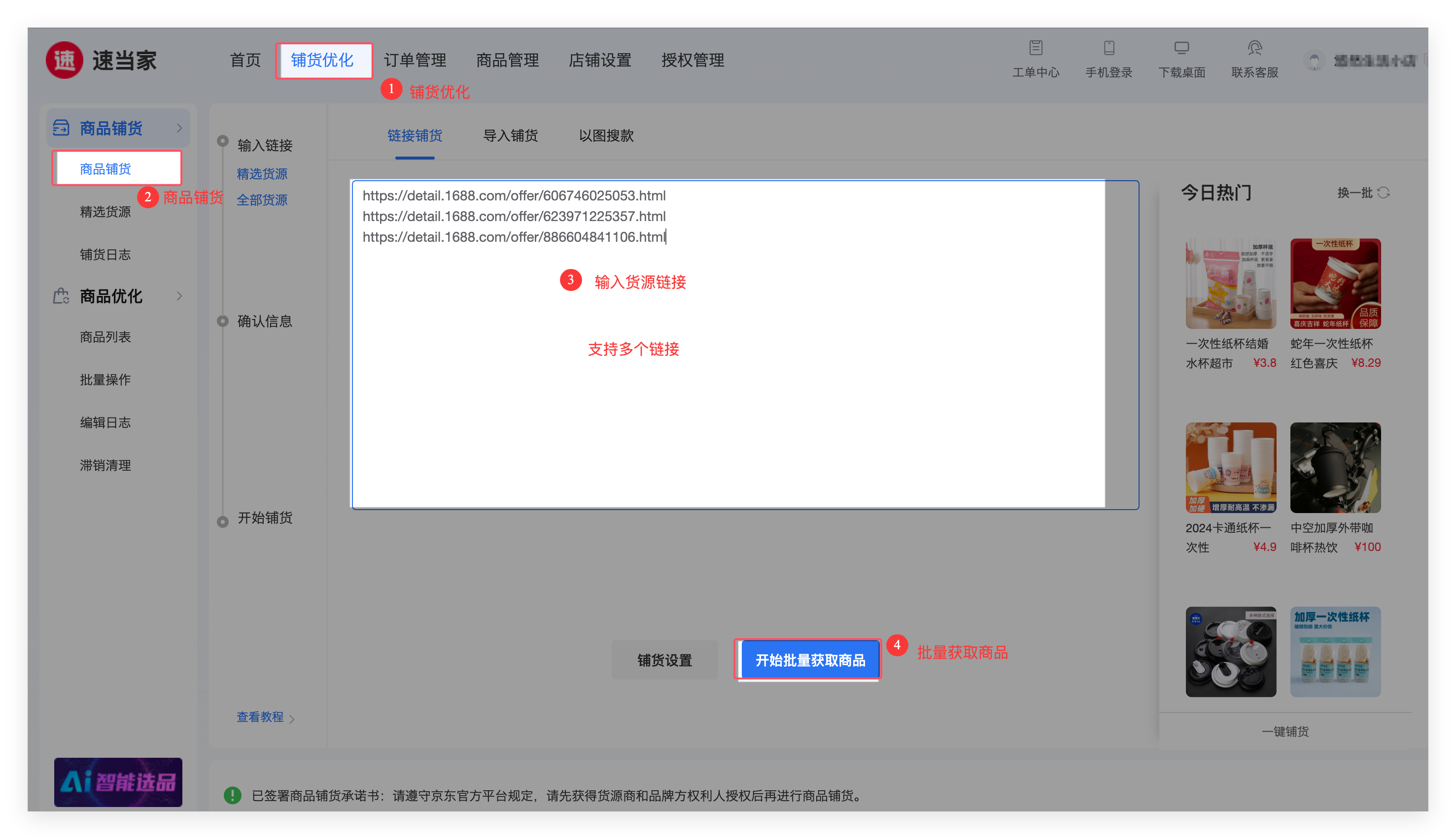 第二步:登录速当家,将货源链接粘帖到【链接铺货】,点击【批量获取商品】