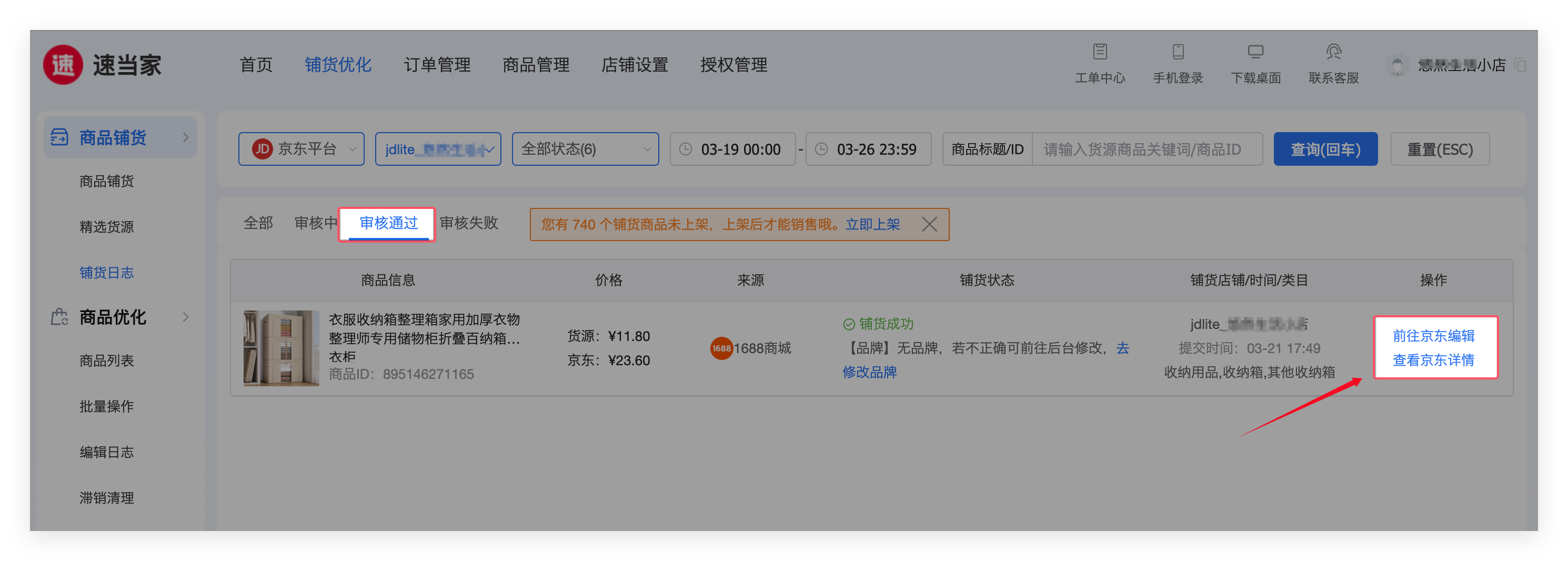 - 速当家铺货成功后,需要等待京东官方审核,审核通过后即展示在京东店铺售卖。