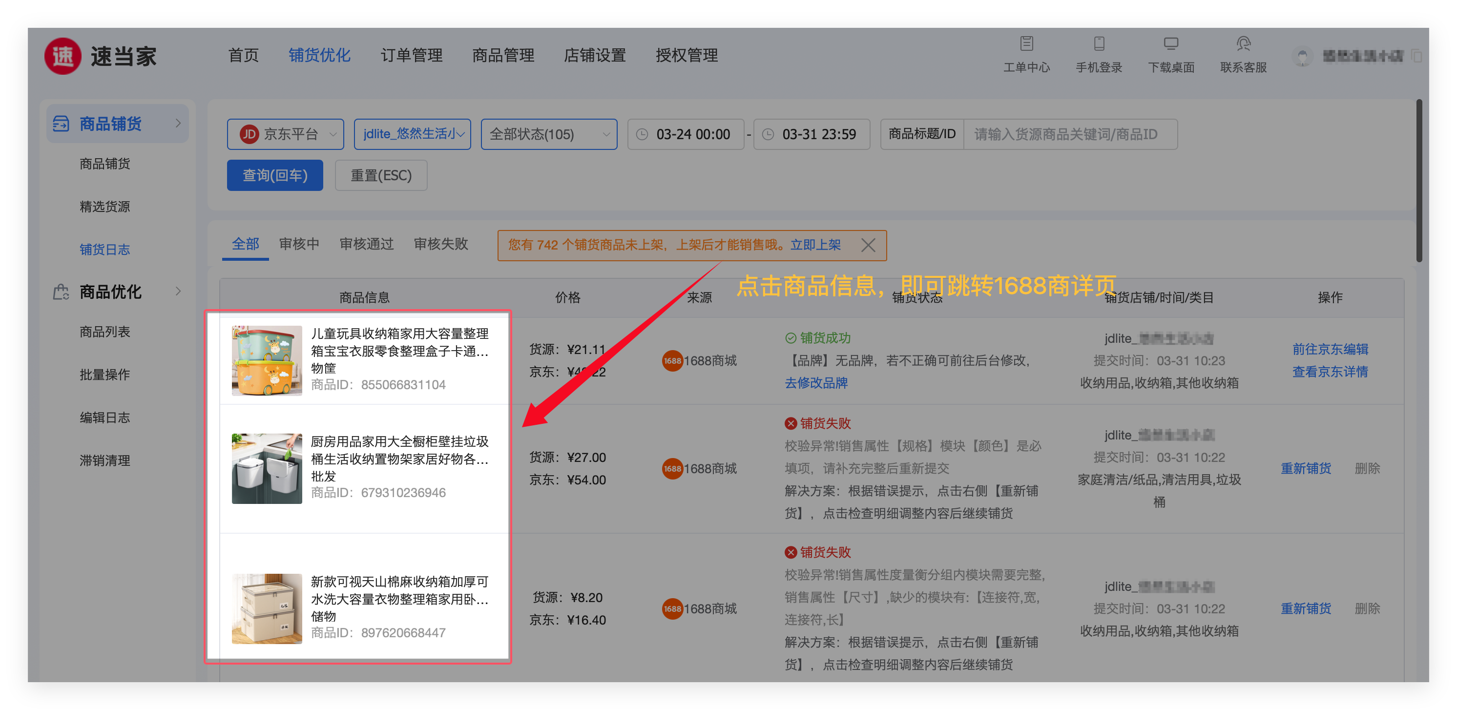 方式1: 在【铺货日志】页面,点击商品信息,即可跳转到 1688货源详情页面