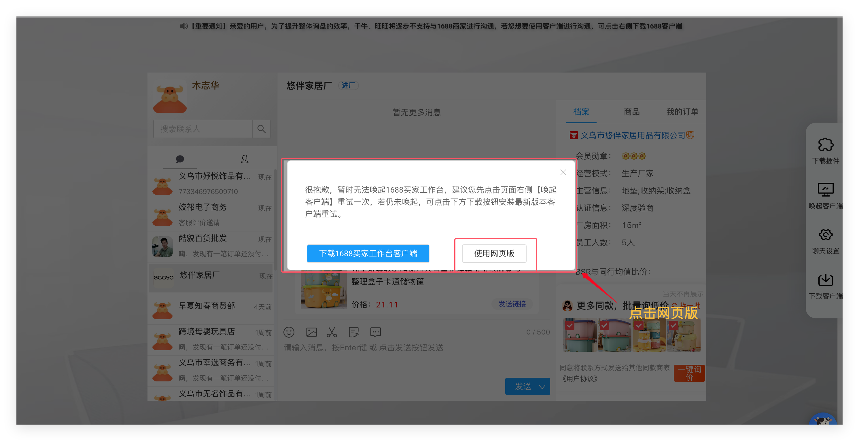 操作路径:点击右边【客服】,若提示无法 唤起1688买家工作台,可点击【使用网页版】,快速联系供应商