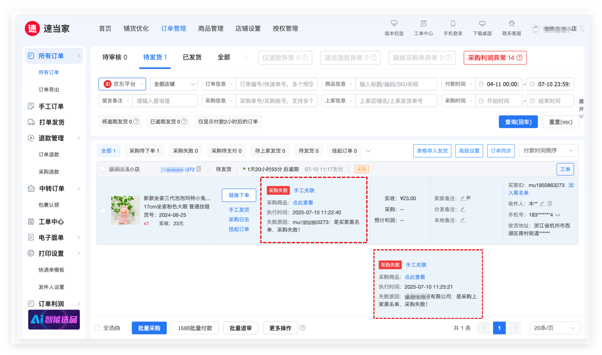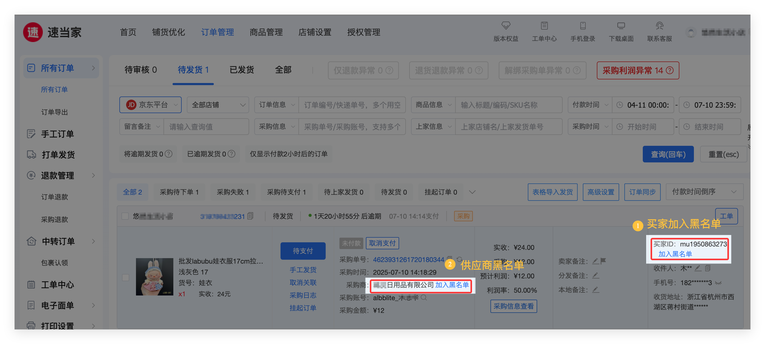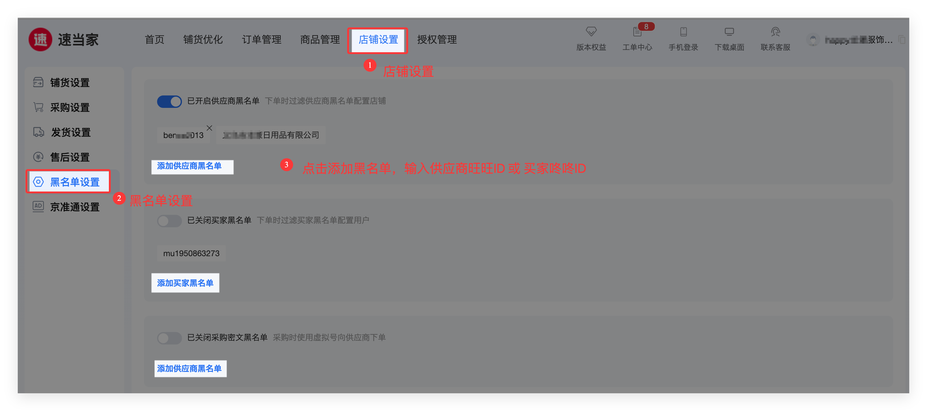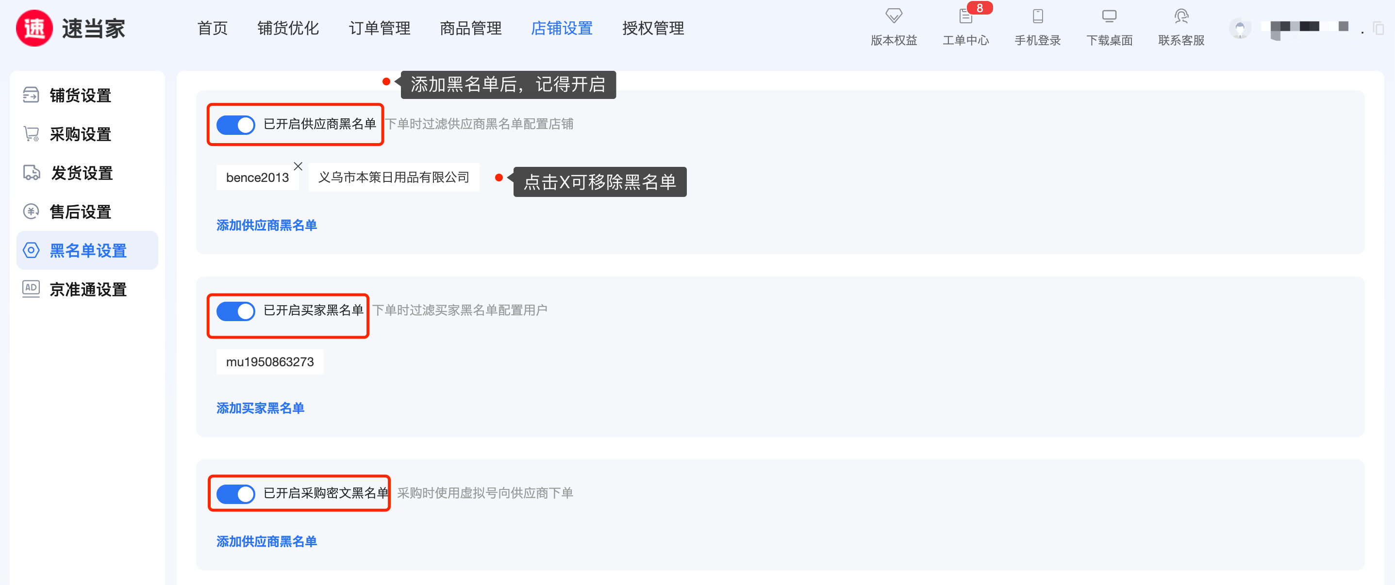 【黑名单功能】支持商家将不良供应商或恶意买家添加至黑名单,添加后将无法采购成功,避免因劣质货源、恶意退货等问题给店铺造成损失。