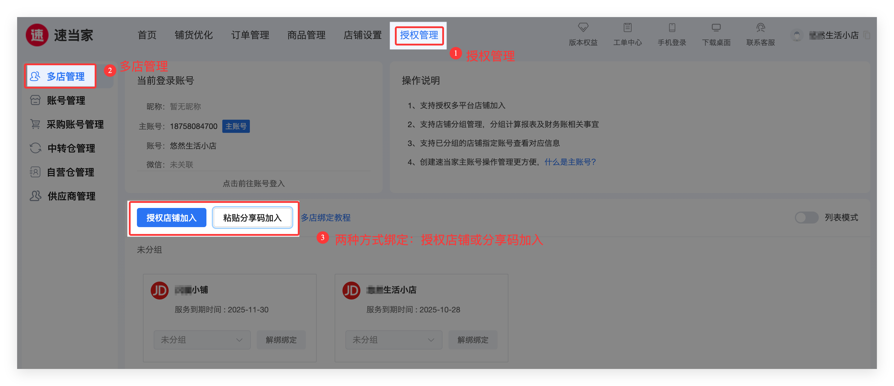 ② 订购后,进入【多店管理】完成店铺绑定关联。
