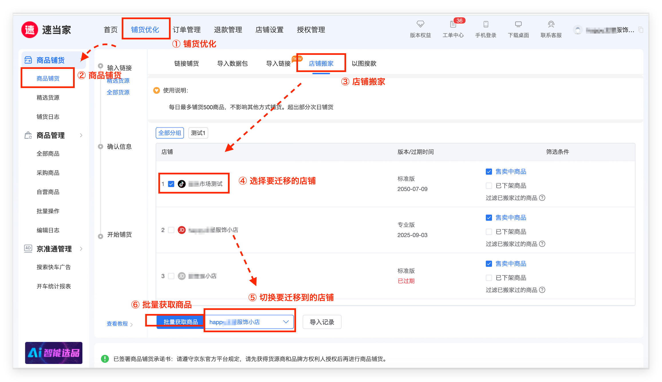 ① 在铺货优化->商品铺货->店铺搬家页面,选择需要迁移的店铺,筛选迁移商品的条件,点击【批量获取商品】。