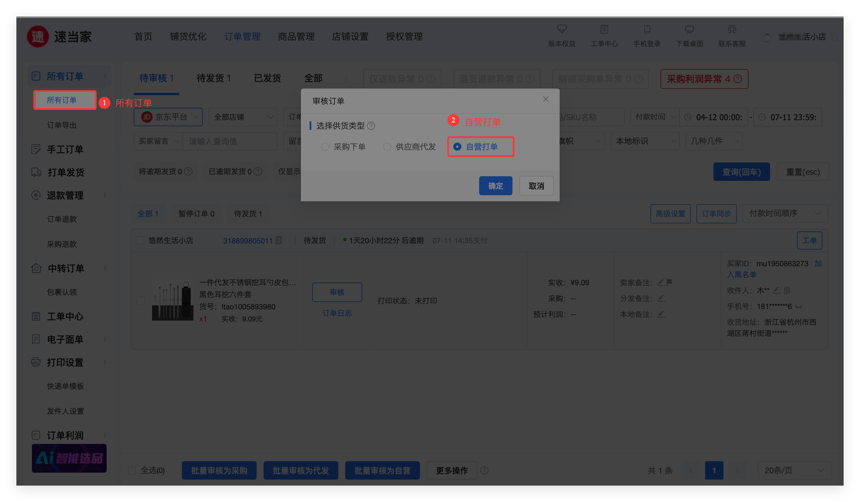 1)将订单类型审核为【自营打单】