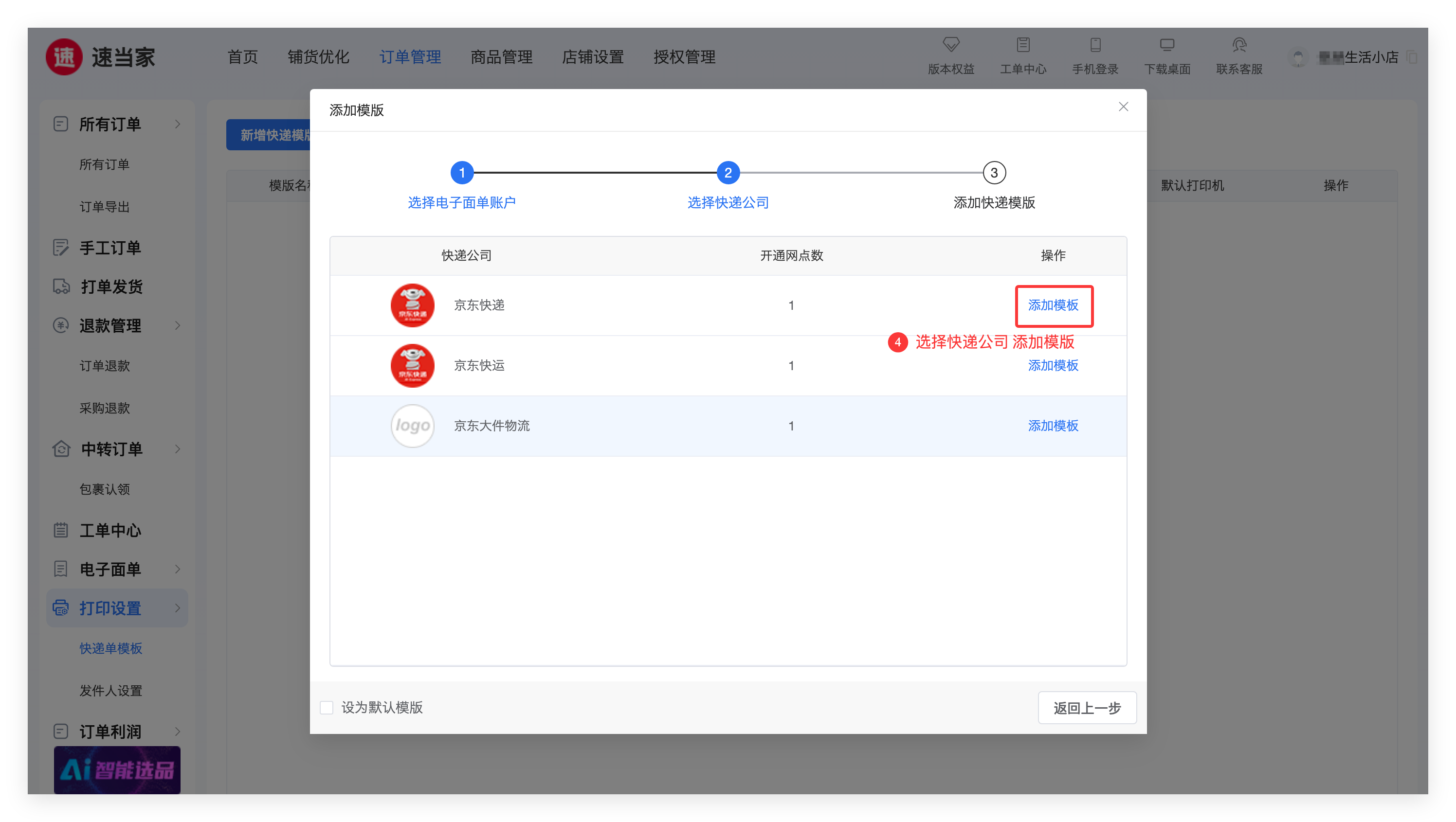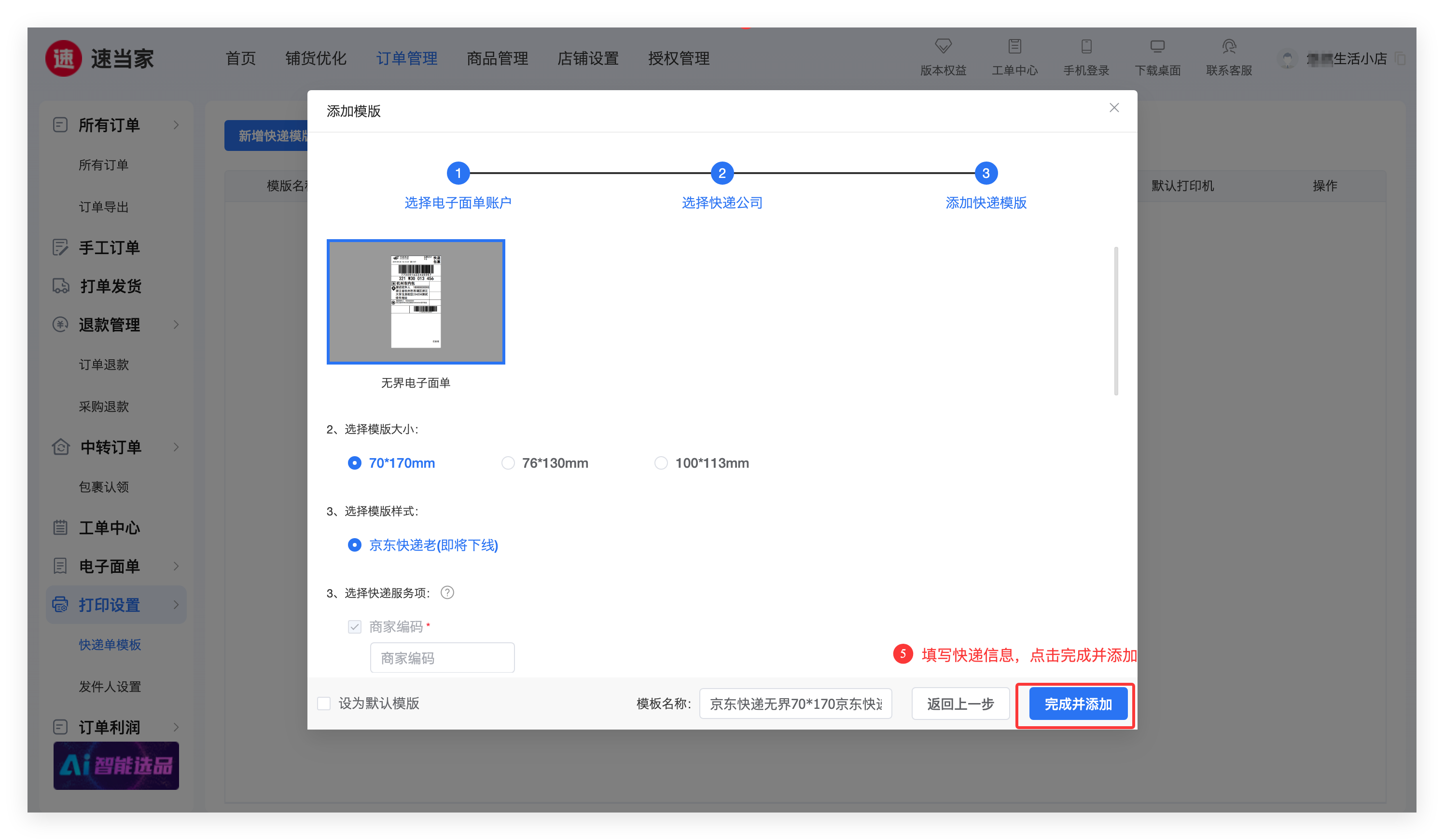 ② 添加快递模版,输入快递信息后,完成并添加