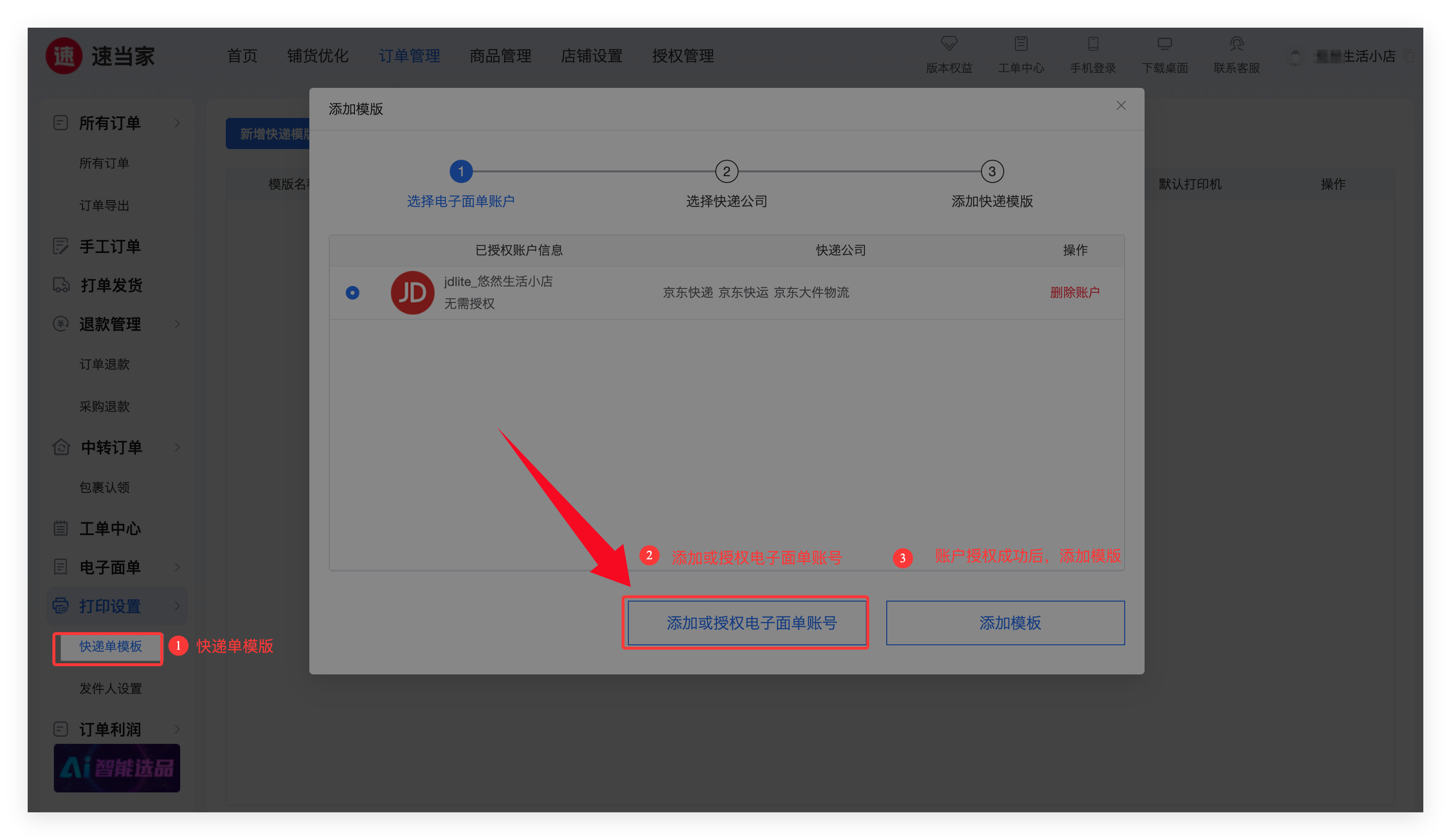 2)在【打单发货】页面,选择订单->选择快递模板,支持单笔/批量打印