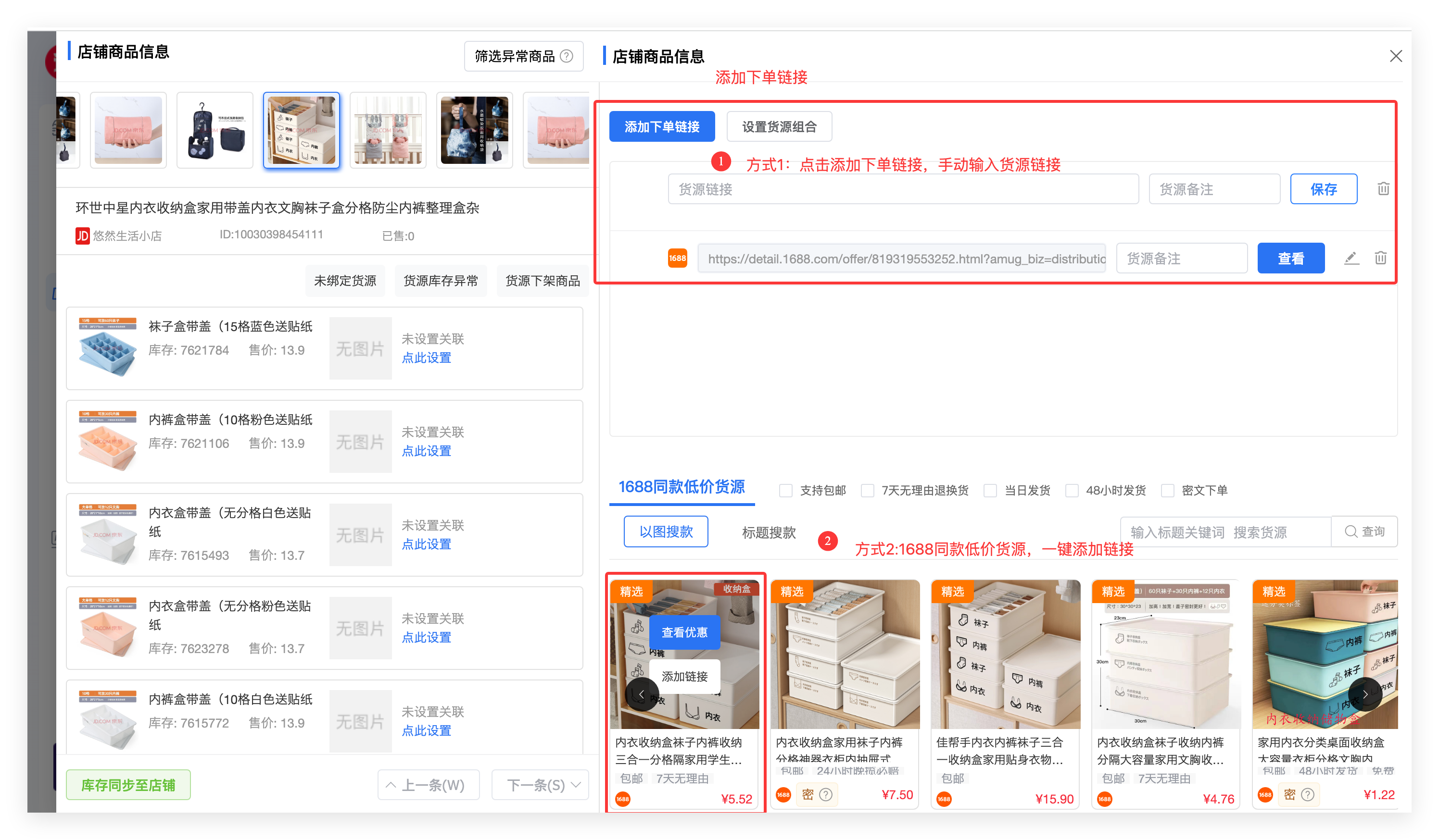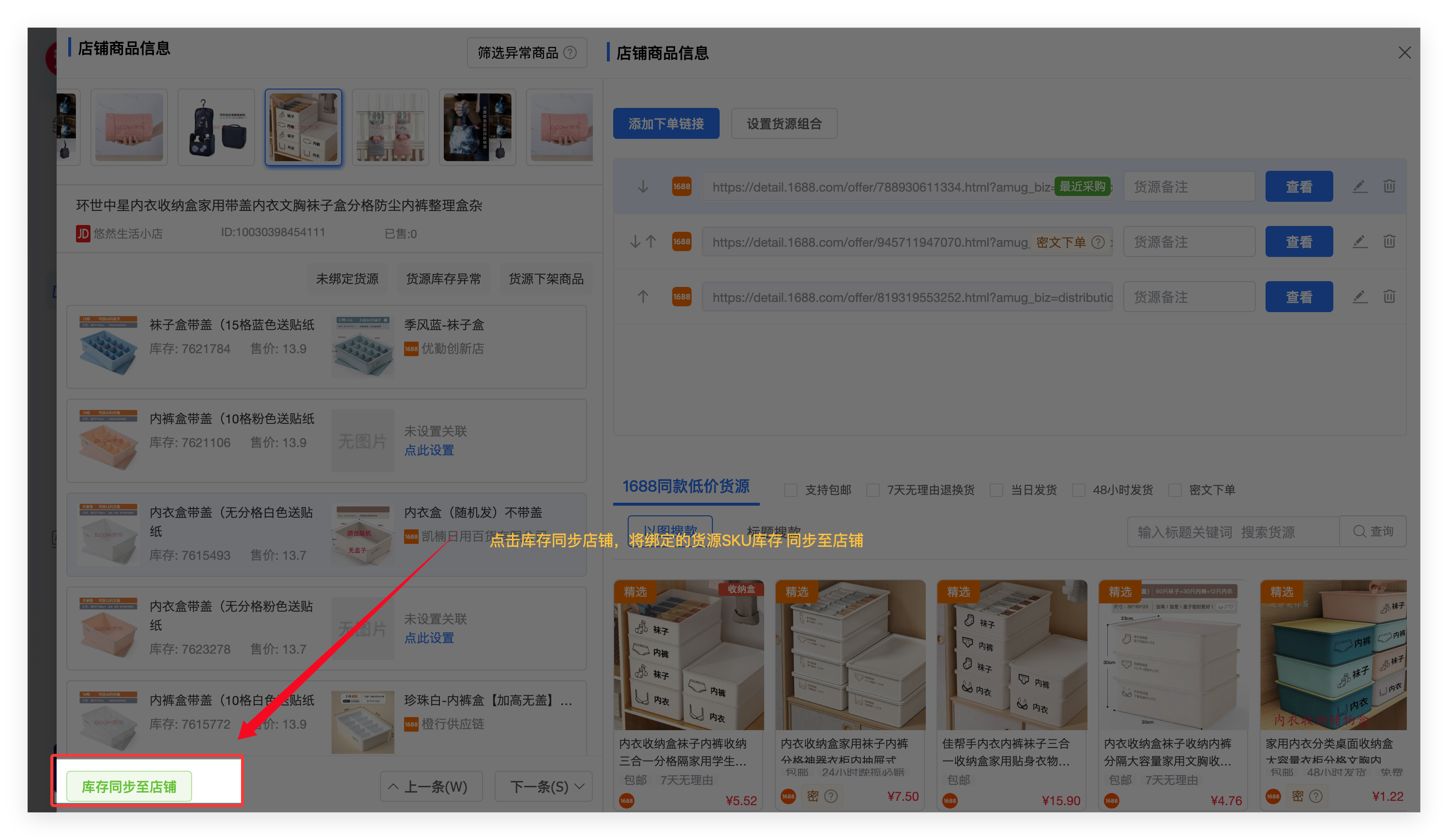 绑定后规格后,点击【库存同步至店铺】,可将绑定的货源SKU库存 同步至店铺。