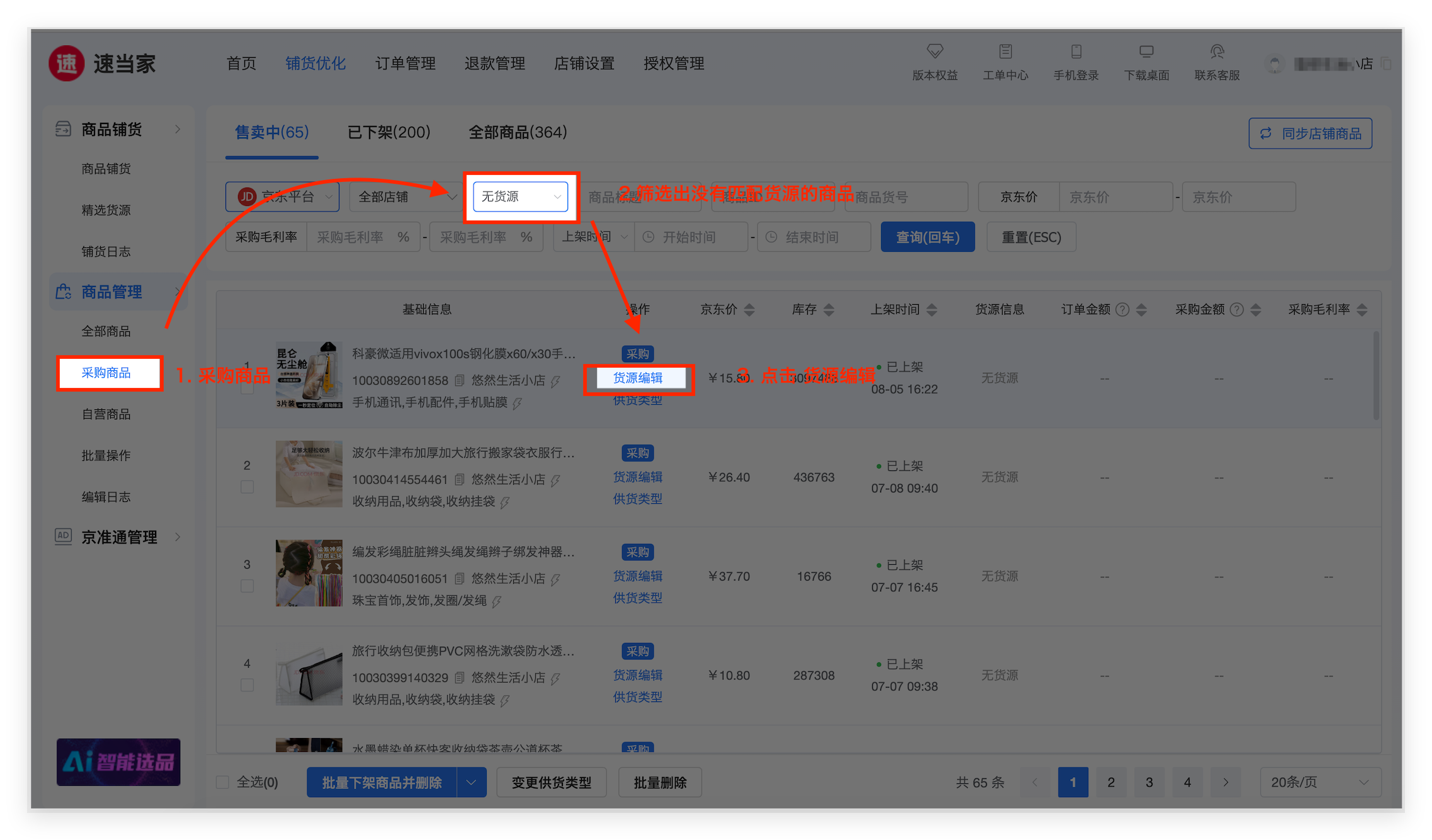 - 在【采购商品】页面,筛选出【无货源】商品。 点击【货源编辑】