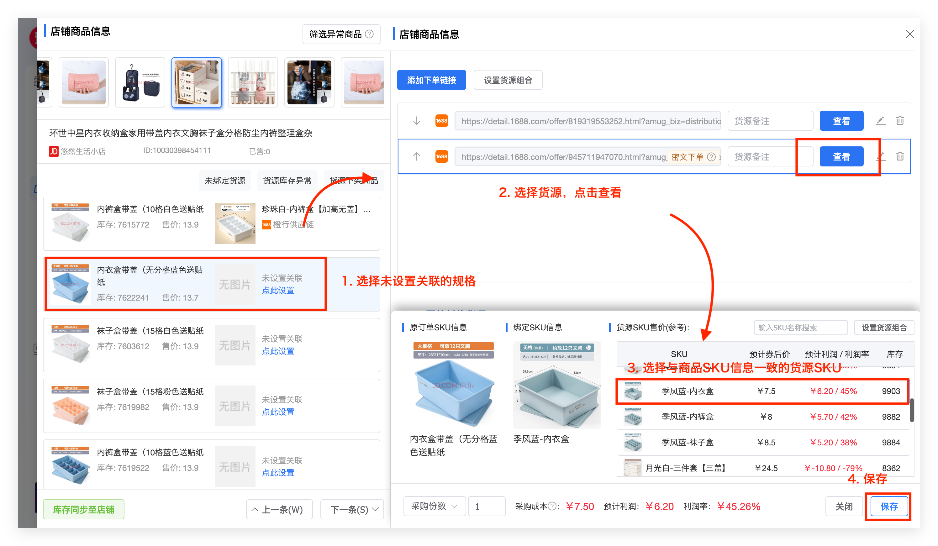 - 选择未设置关联的规格-> 选择货源,点击查看-> 选择与商品SKU一致的货源SKU