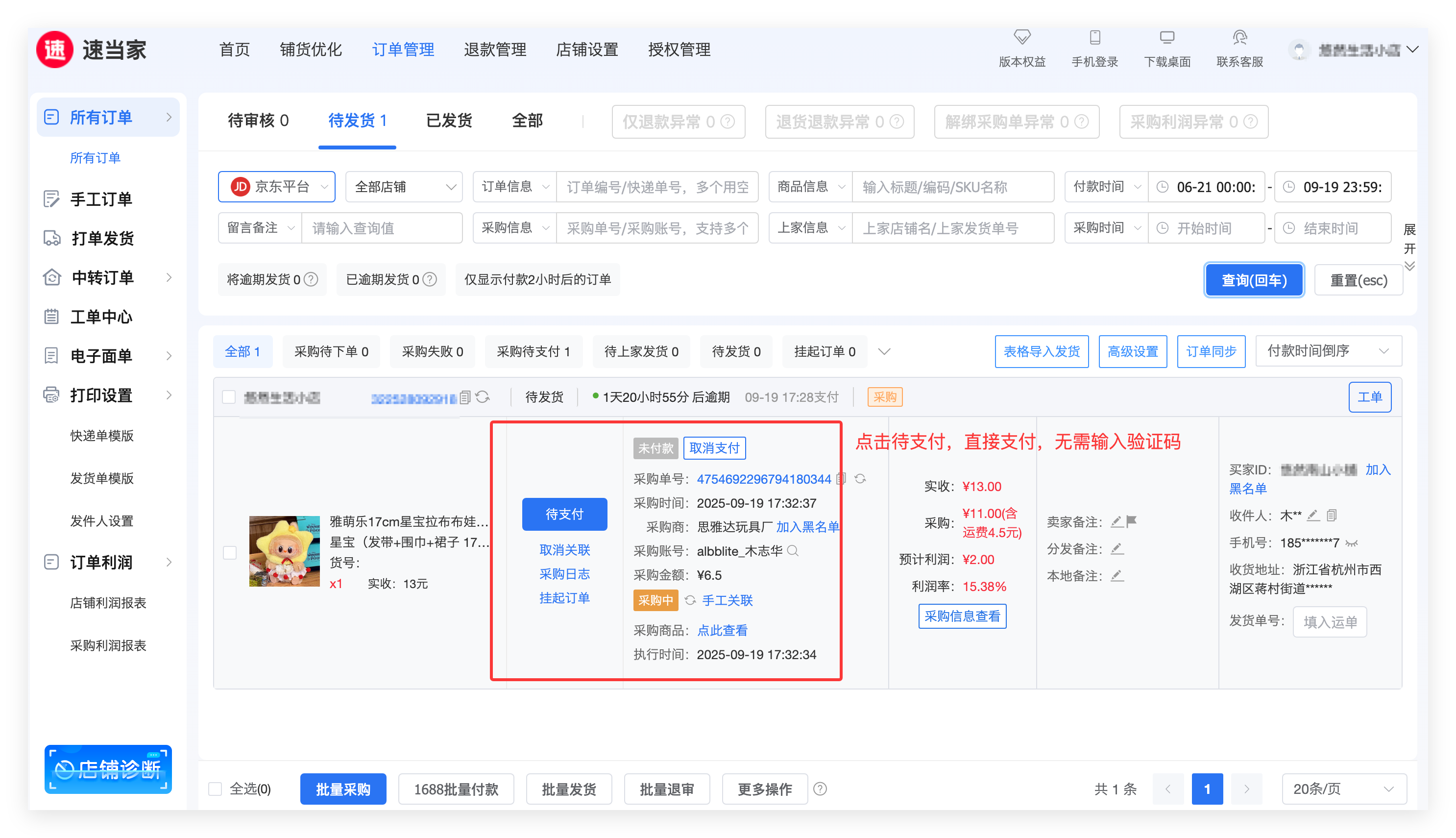 店铺有了订单后,在速当家一键下单-去支付,可直接支付,无需输入密码。