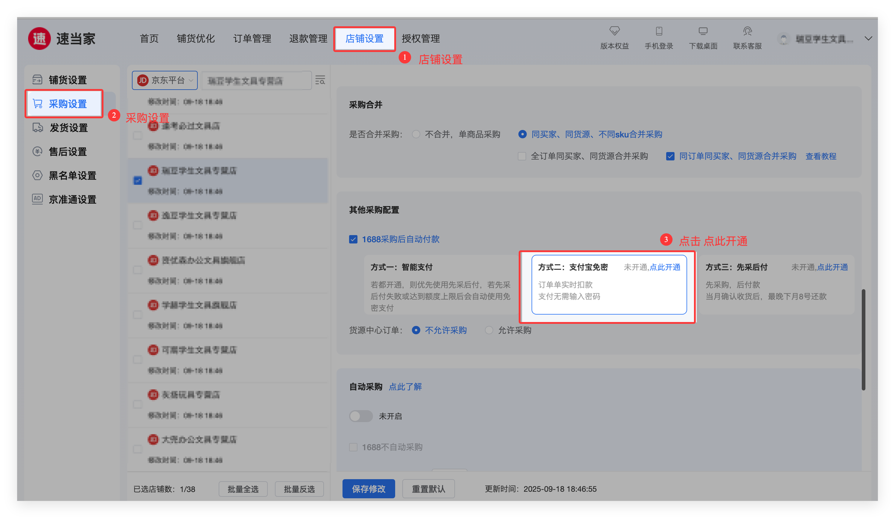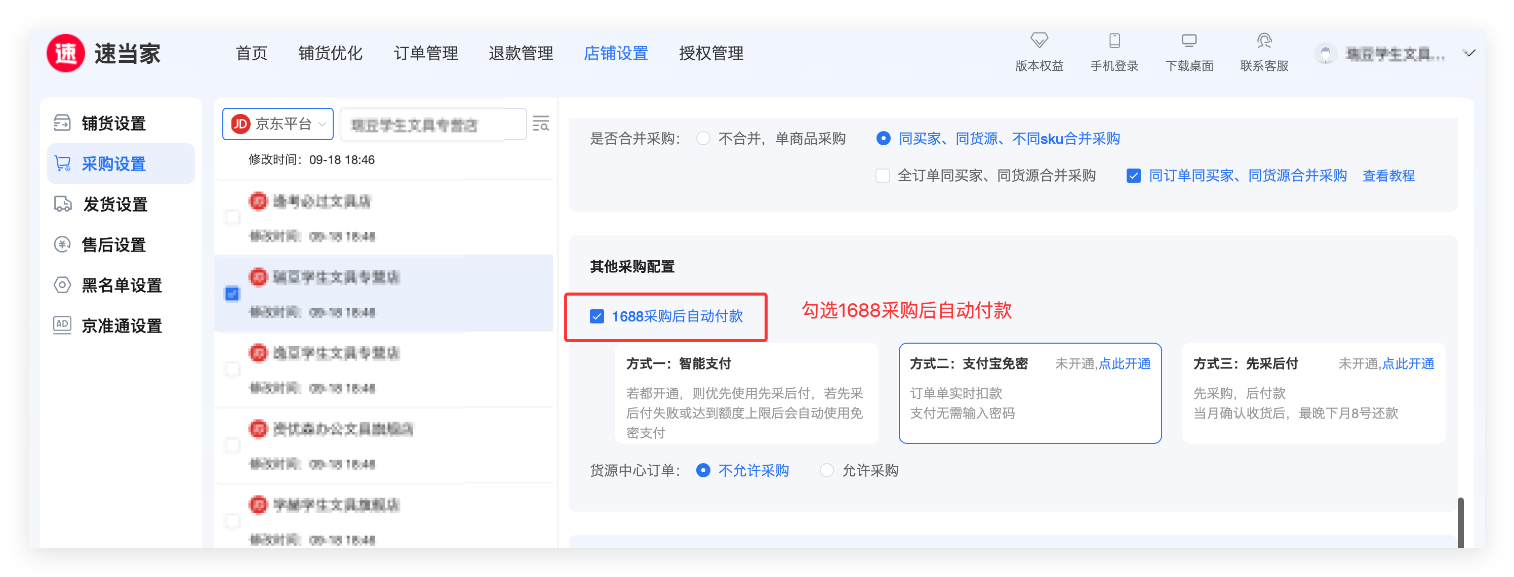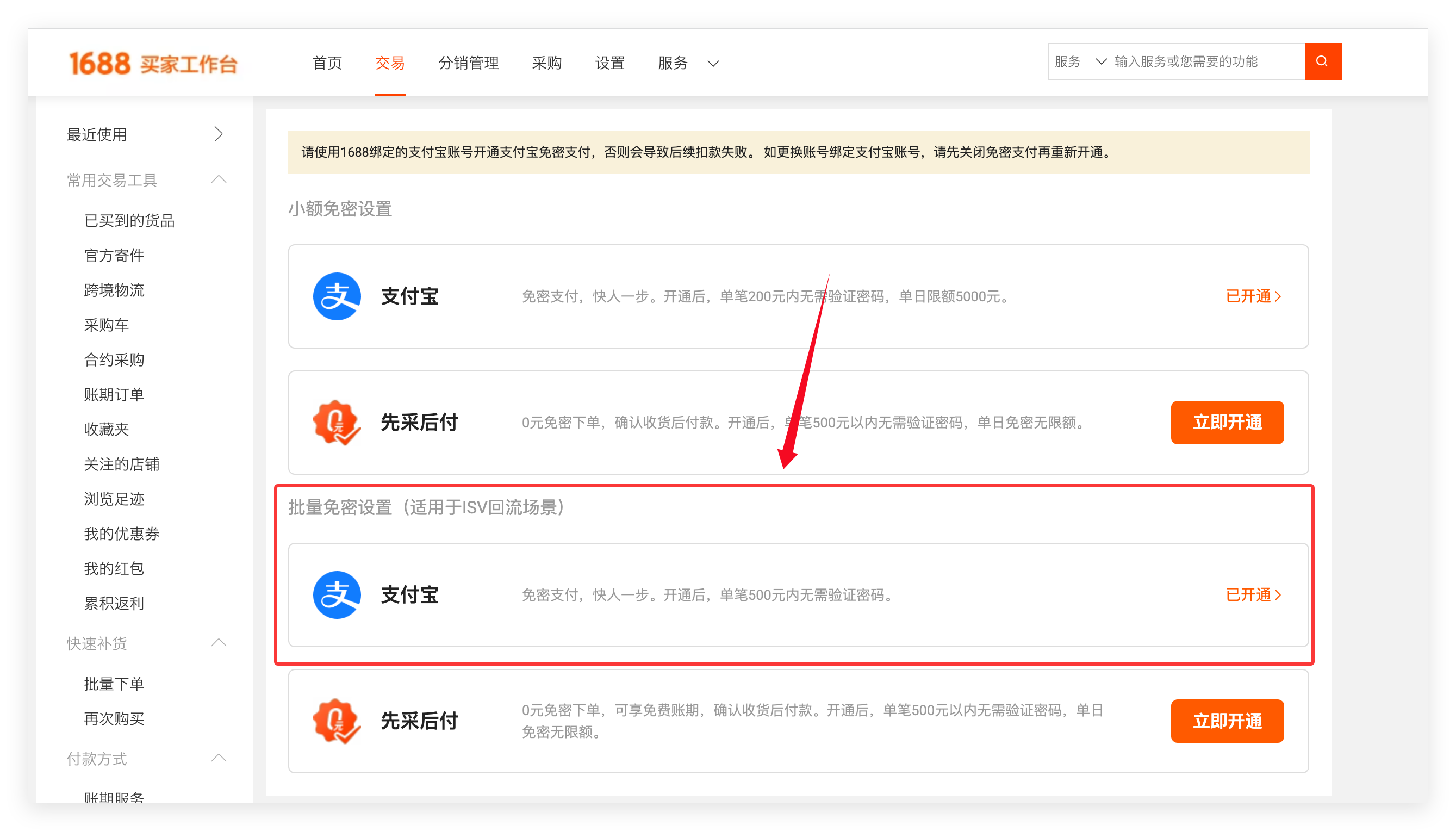 速当家支持1688免密支付,开通后支付无需输入密码, 大大提高采购效率!