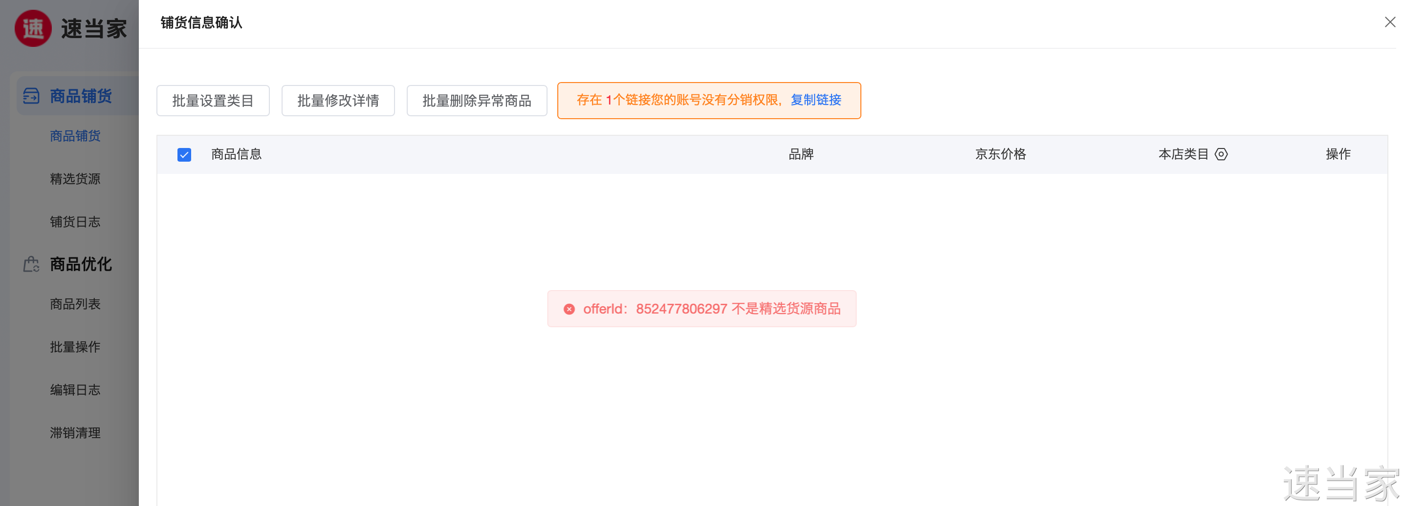 该商品不是精选货源商品,需要您的1688账号是该供应商的分销商,并有该商品的分销权限,才能铺货和采购改商品。