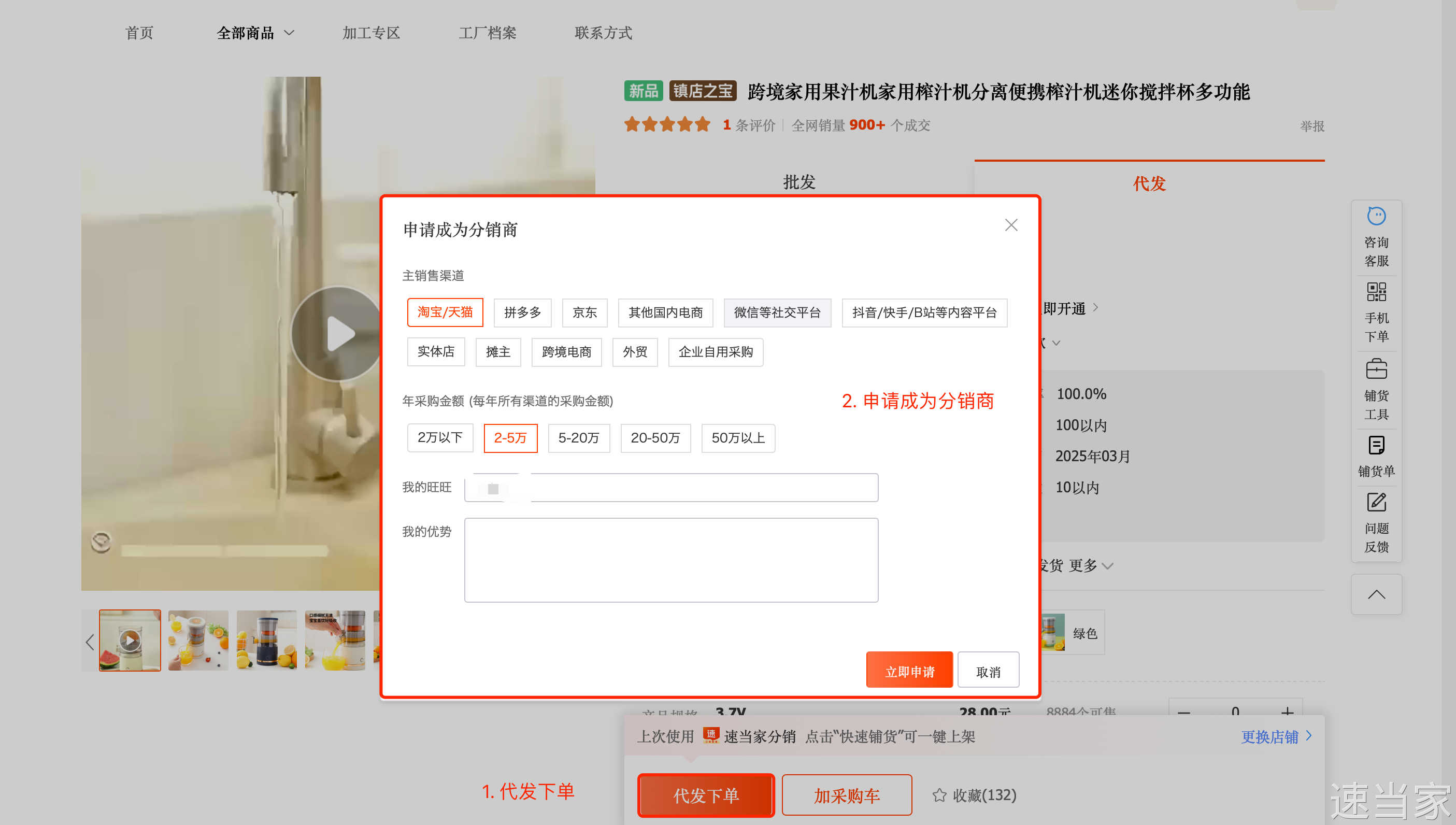 当商家铺货时,系统提示:您的账号没有分销权限,如何处理?