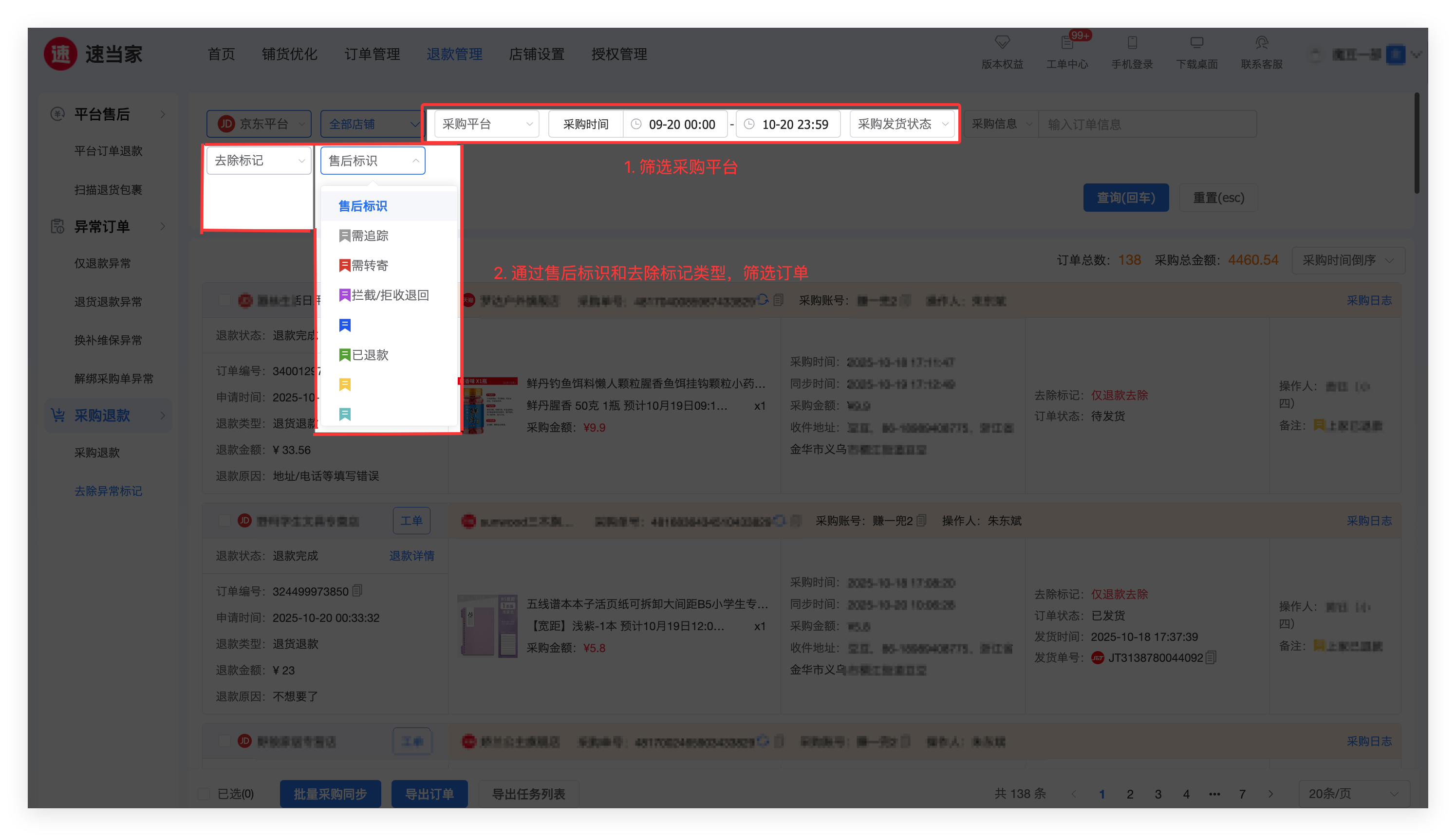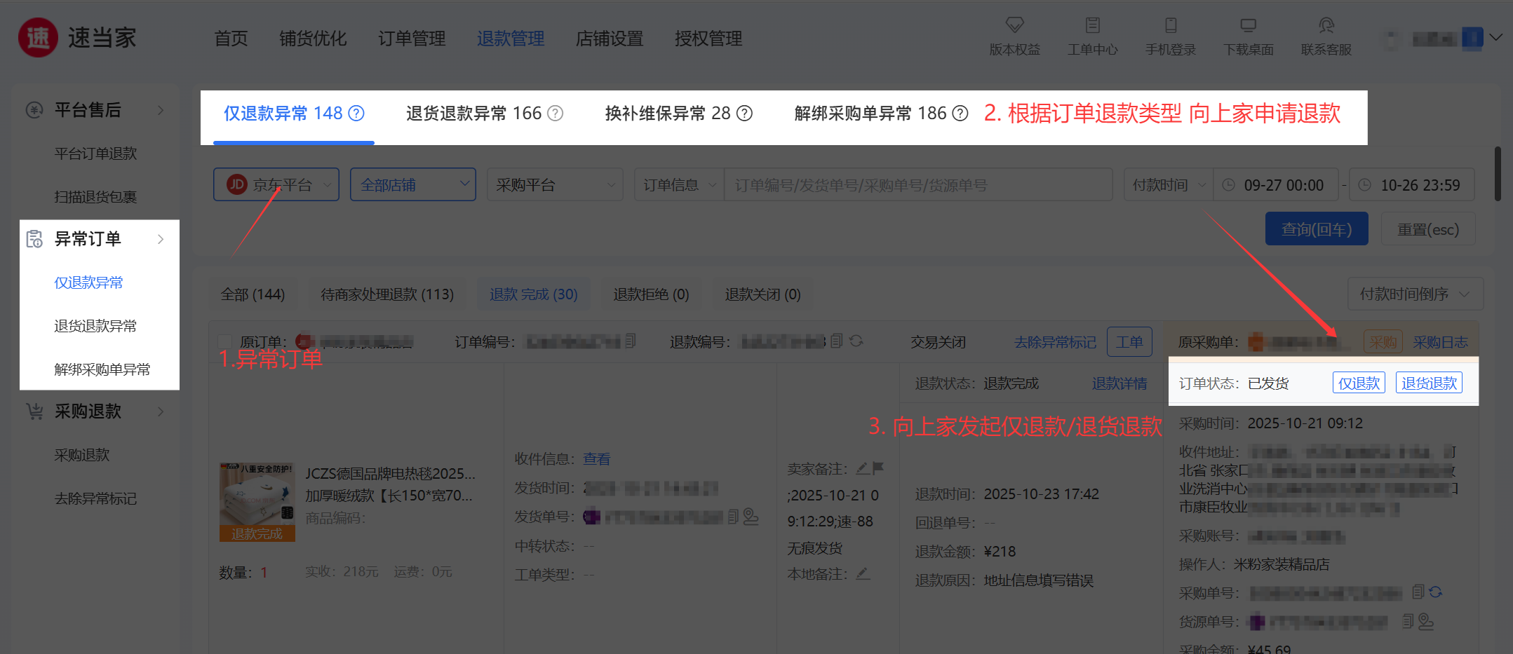退款异常订单:是所有平台退款订单未向上家申请退款或拒绝/关闭的订单,高亮提醒商家尽快处理。