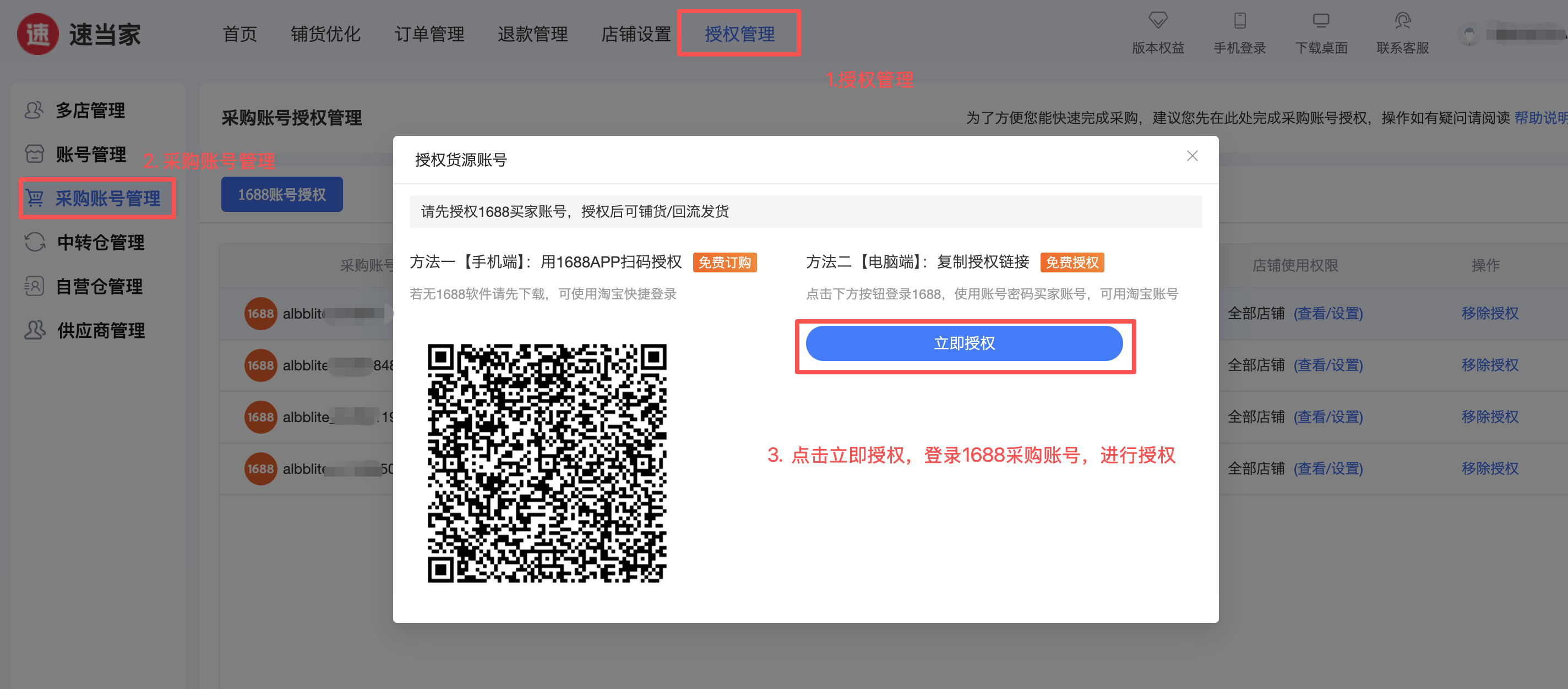 手工关联1688采购订单,需要先授权1688采购账号,支持授权多个账号。