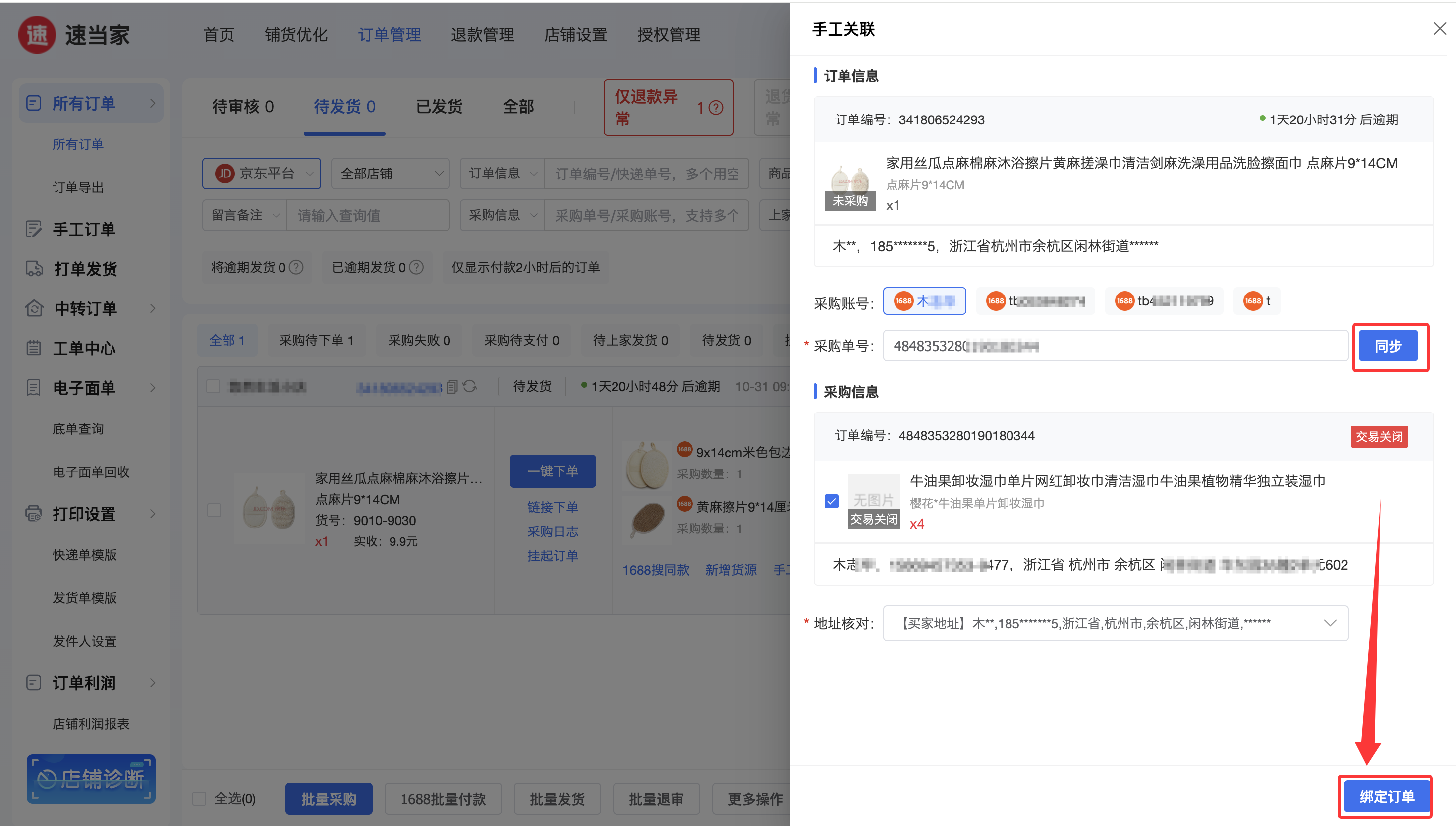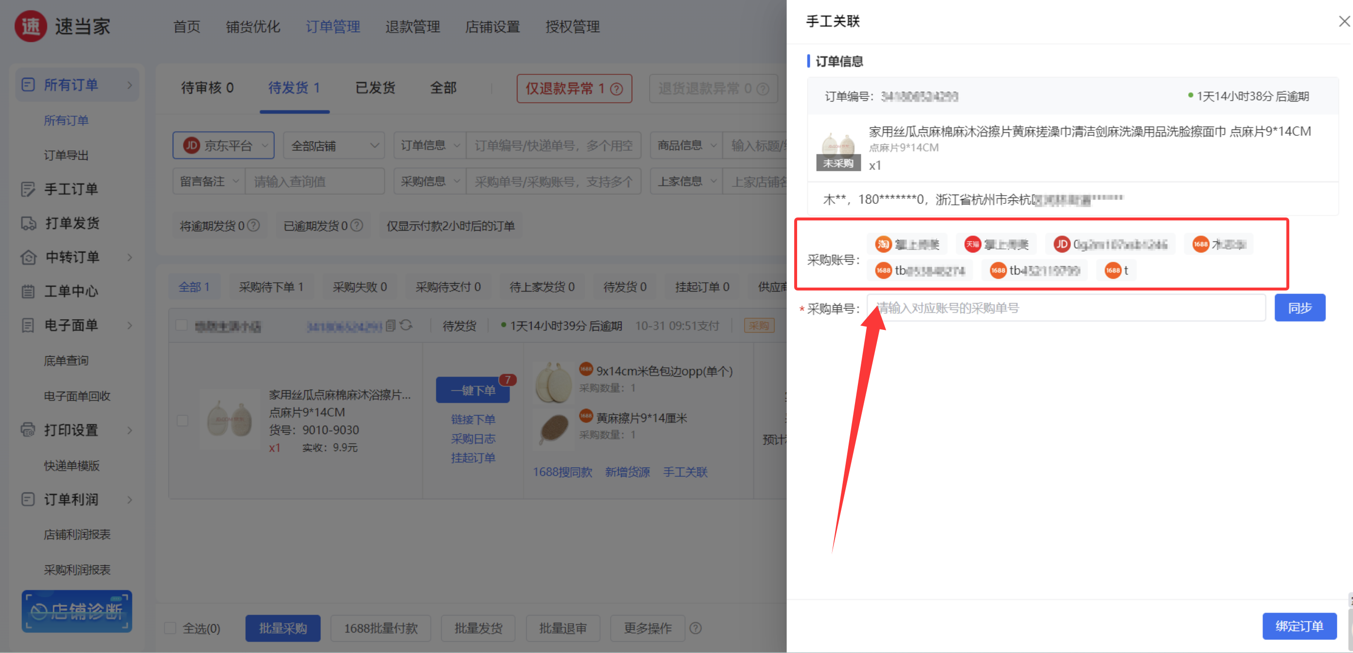 添加好账号后,选择采购订单对应的平台,输入采购订单号,同步后绑定订单。
