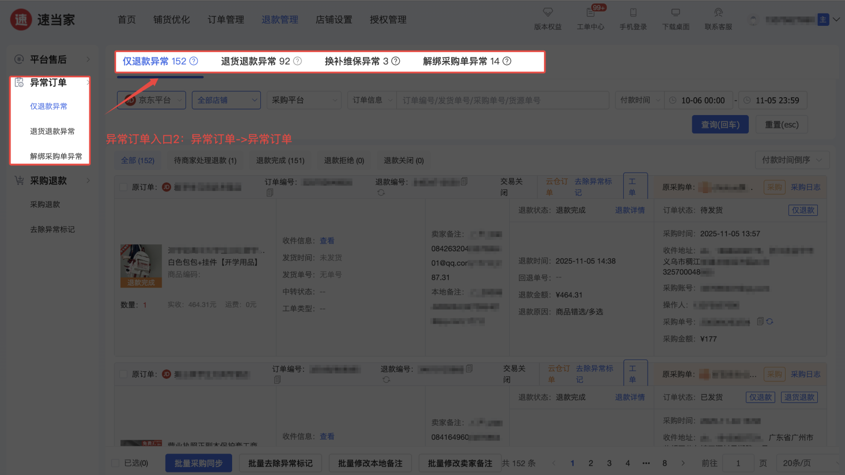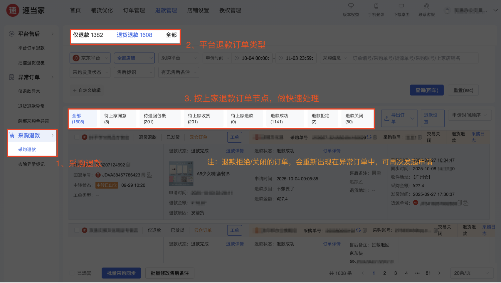 退款异常订单:是所有在速当家采购、平台退款订单且未向上家申请退款或被上家拒绝退款/关闭的订单。