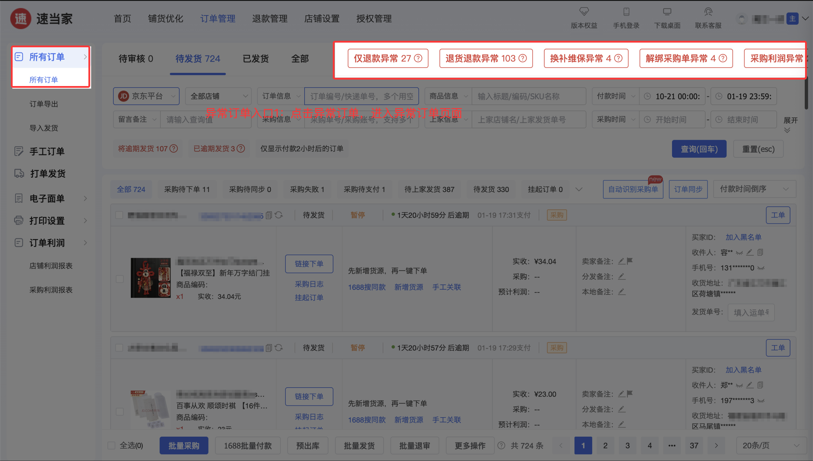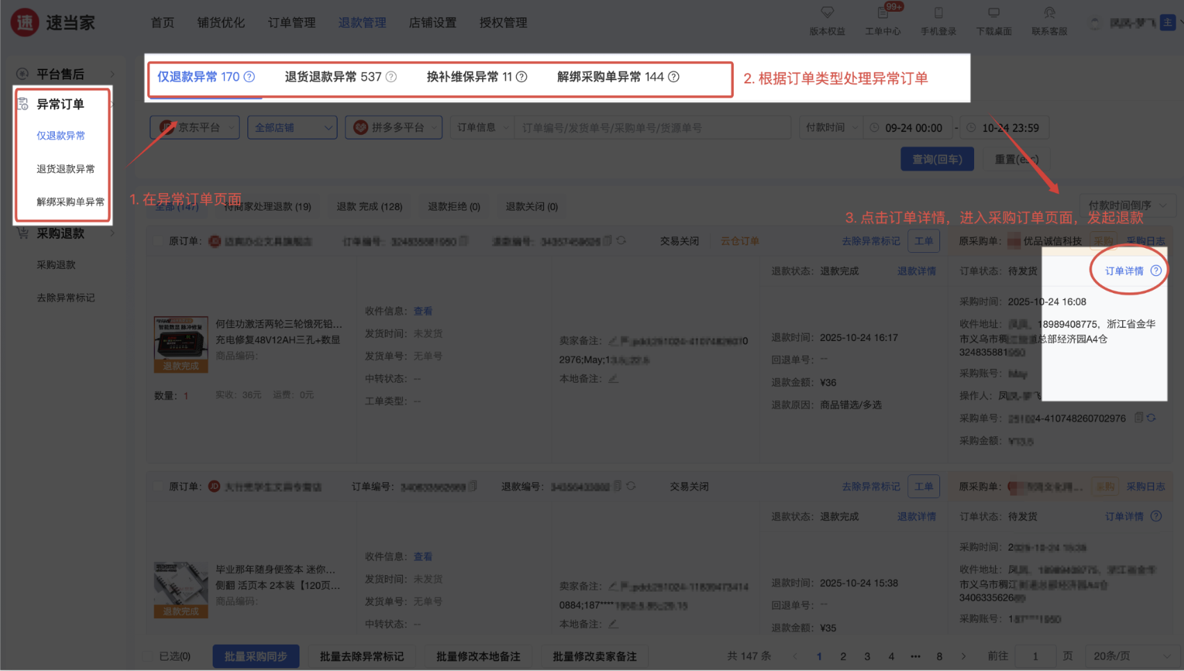 还在为 “买家退款,却忘向上家申请”“上家拒退未及时跟进” 白白损失利润么?速当家【异常订单】,自动识别所有平台退款订单未向上家申请或拒绝/关闭的订单,不遗漏每一笔退款异常订单,最大限度守住利润!