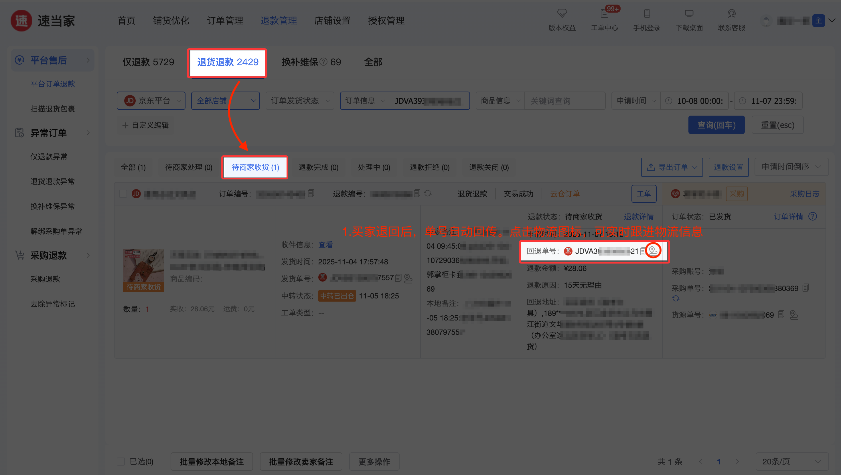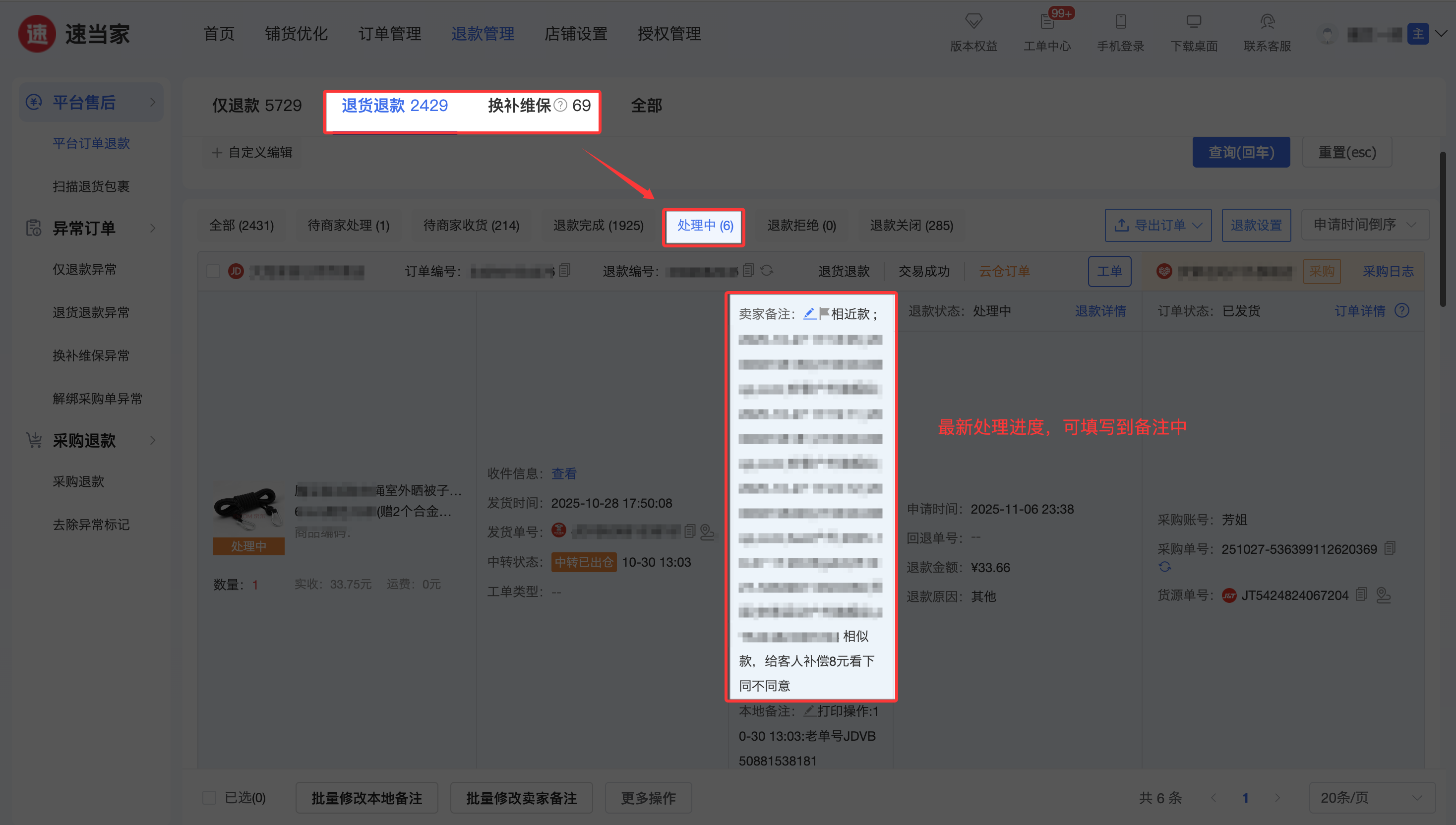 2、全程跟进售后订单:实时同步平台售后状态,持续跟进。要重点关注退货退款\换补维保类型中【待商家收货】和【处理中】的订单,可将最新处理进度,填写到备注中 ,避免遗忘!
