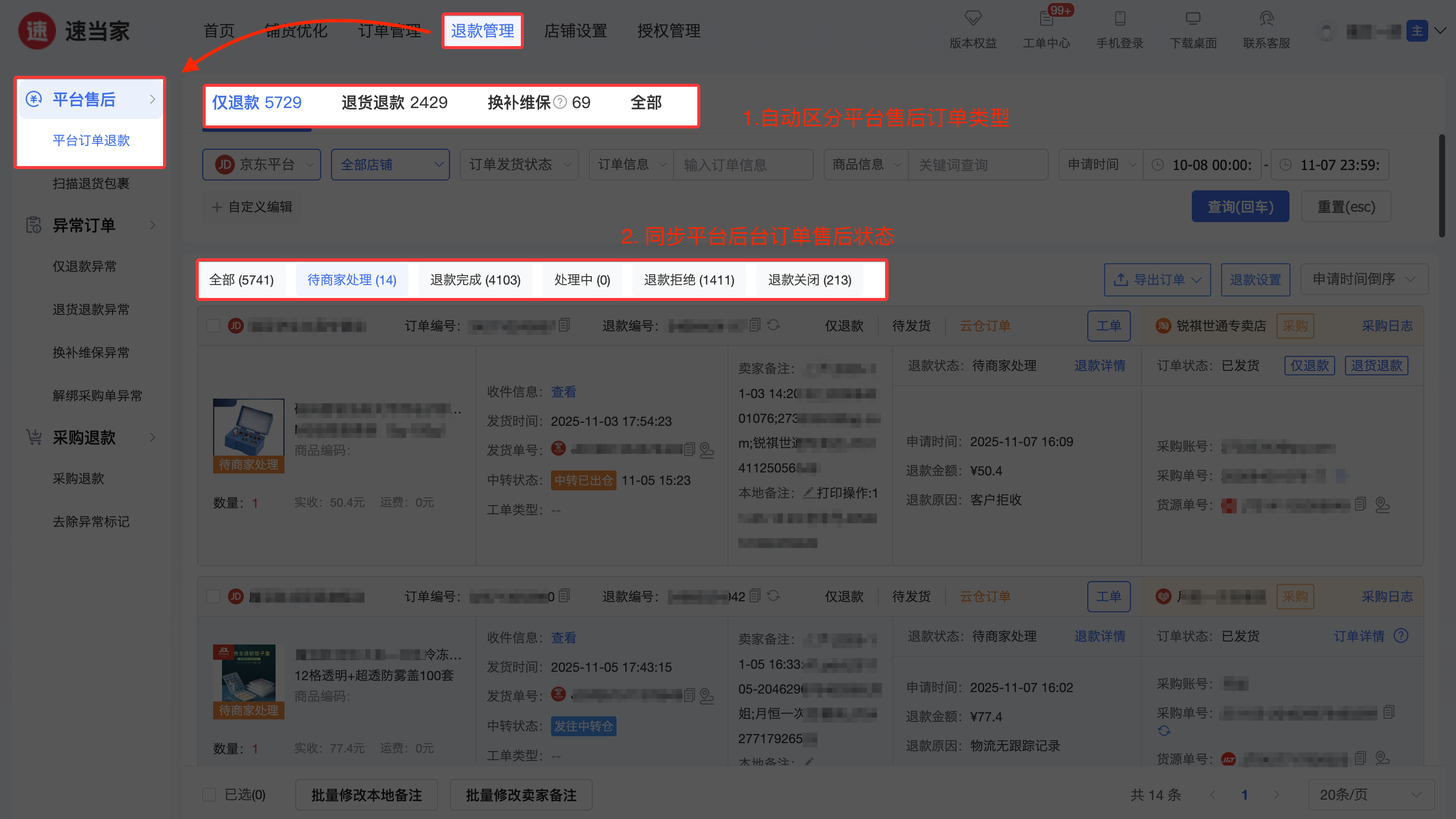 1、快速定位处理:按售后订单类型快速筛选,一键定位平台退款订单,快速处理!