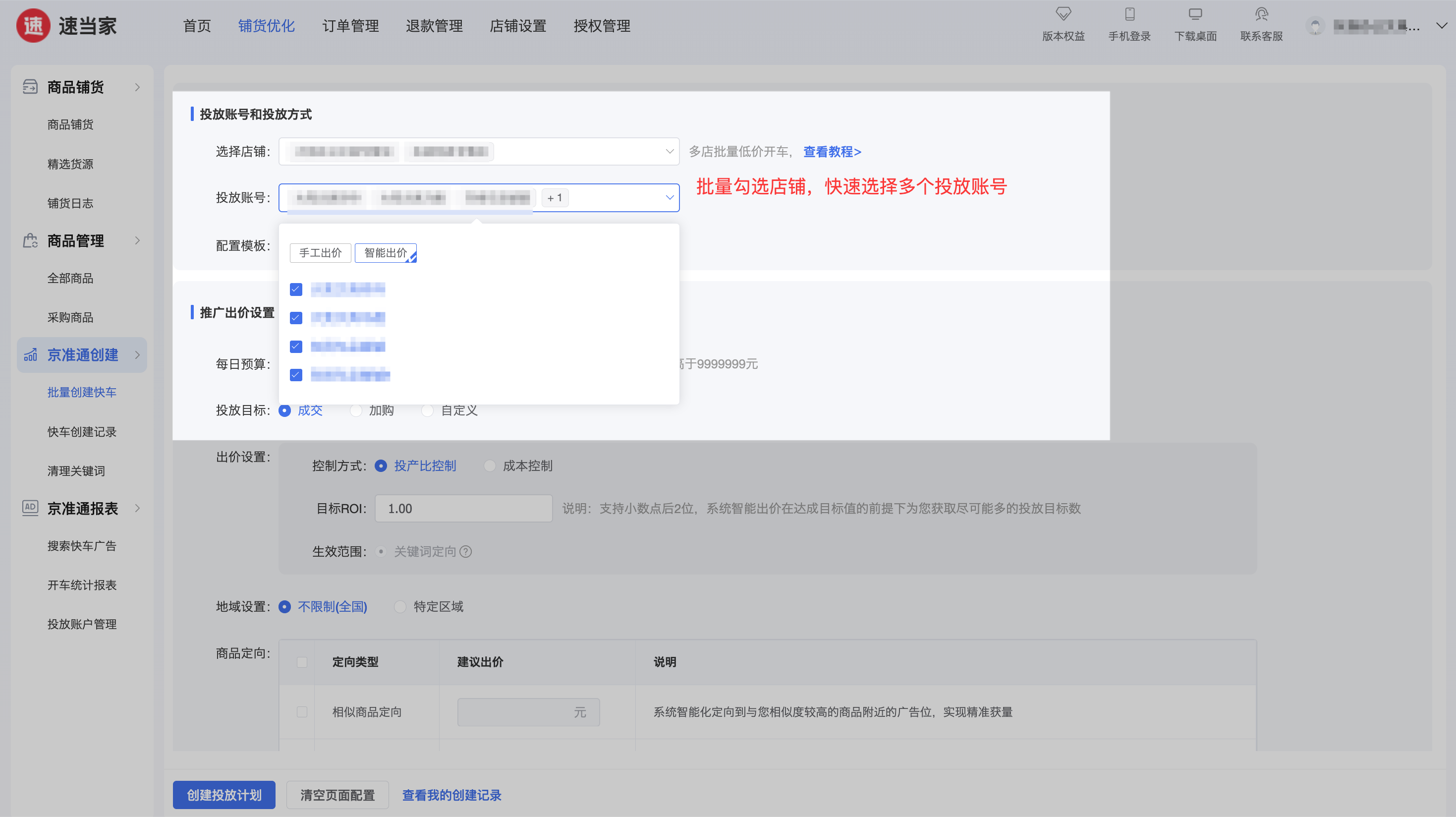 在速当家铺货上新后,无需切换登录京准通账号,支持单店单pin / 多店多PIn 自由切换,告别重复操作!