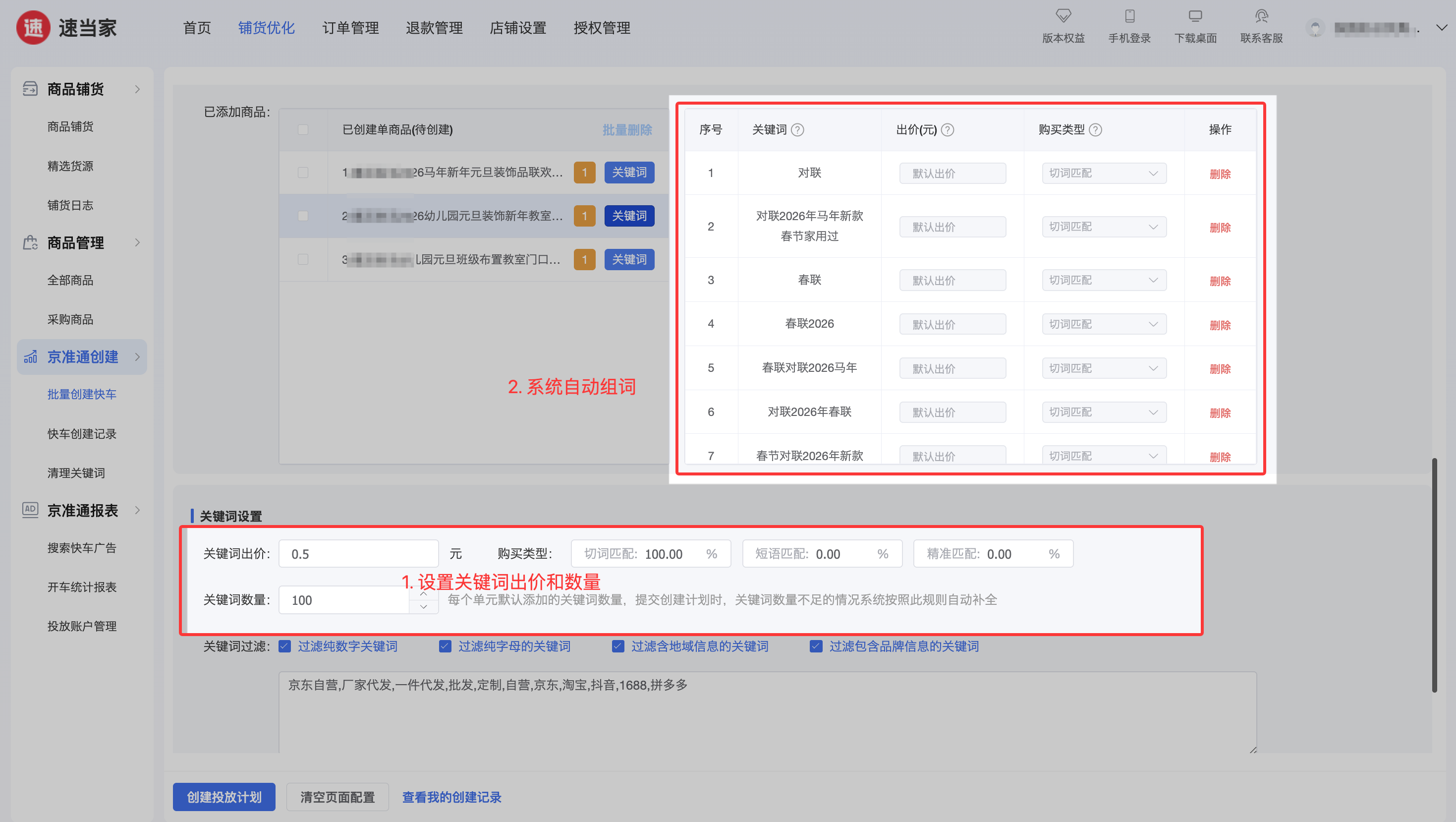 - 批量自动匹配核心产品词、热搜词、竞品词、蓝海飙升词,无需人工选词,完成高效精准投放,新手也能轻松上手!