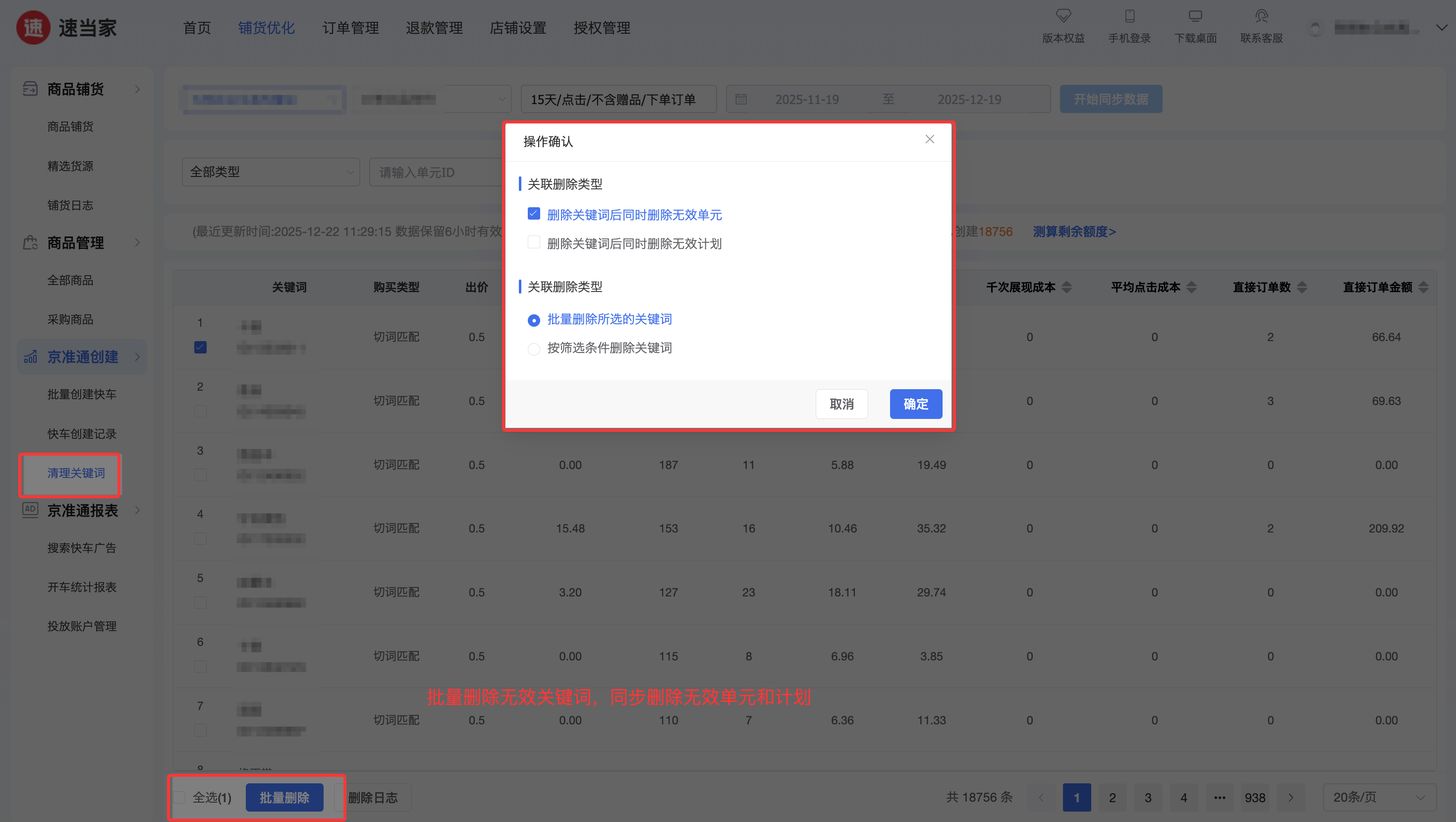 自定义筛选条件,一键删除无点击、无转化的废词,同步清理关联无效单元 / 计划,优化投放结构,每一分预算都花在刀刃上!