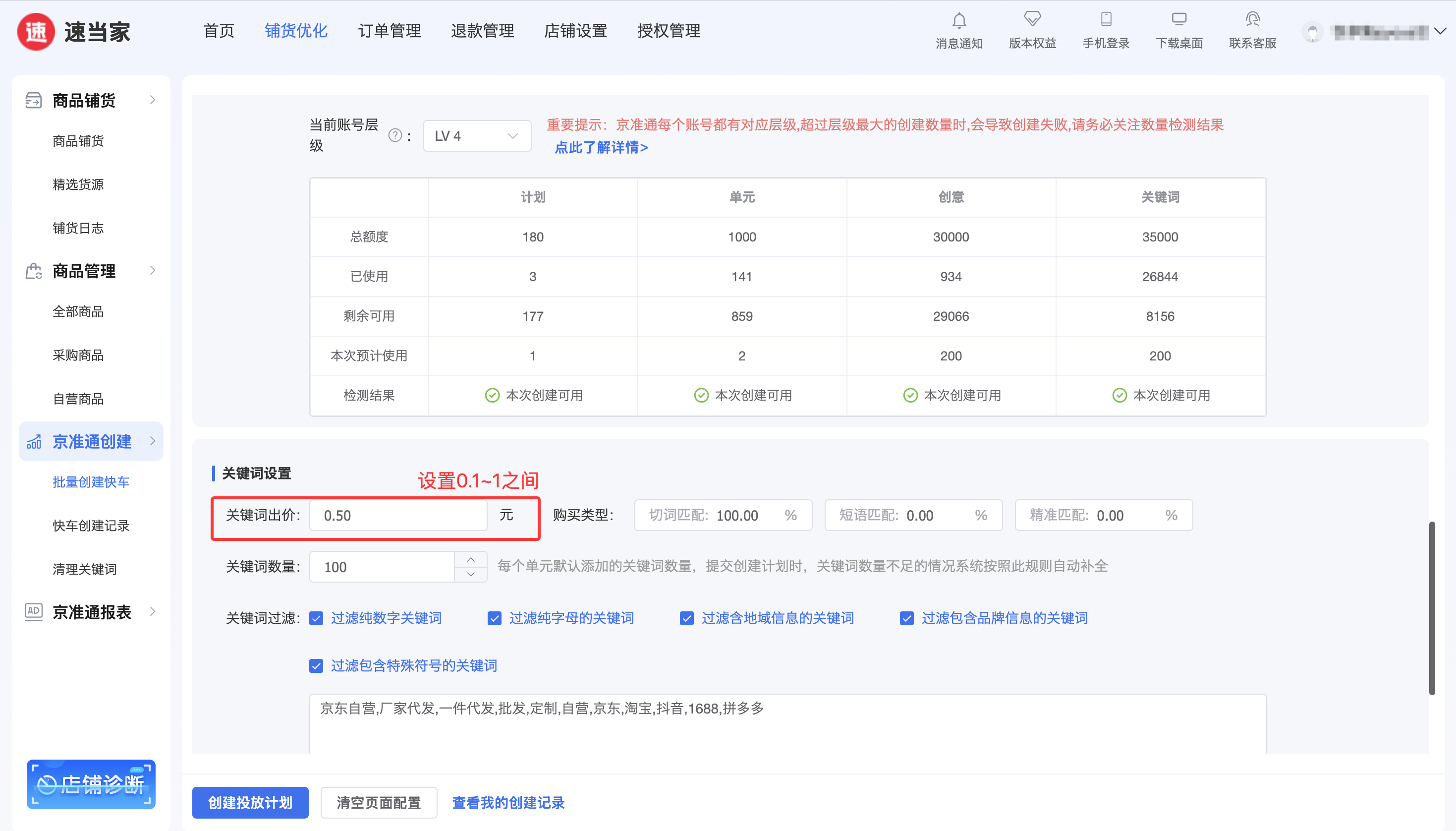 - 1)先设 0.1 元最低价,计划创建成功后,去京准通后台监控数据;若没有曝光,再批量提高关键词出价。