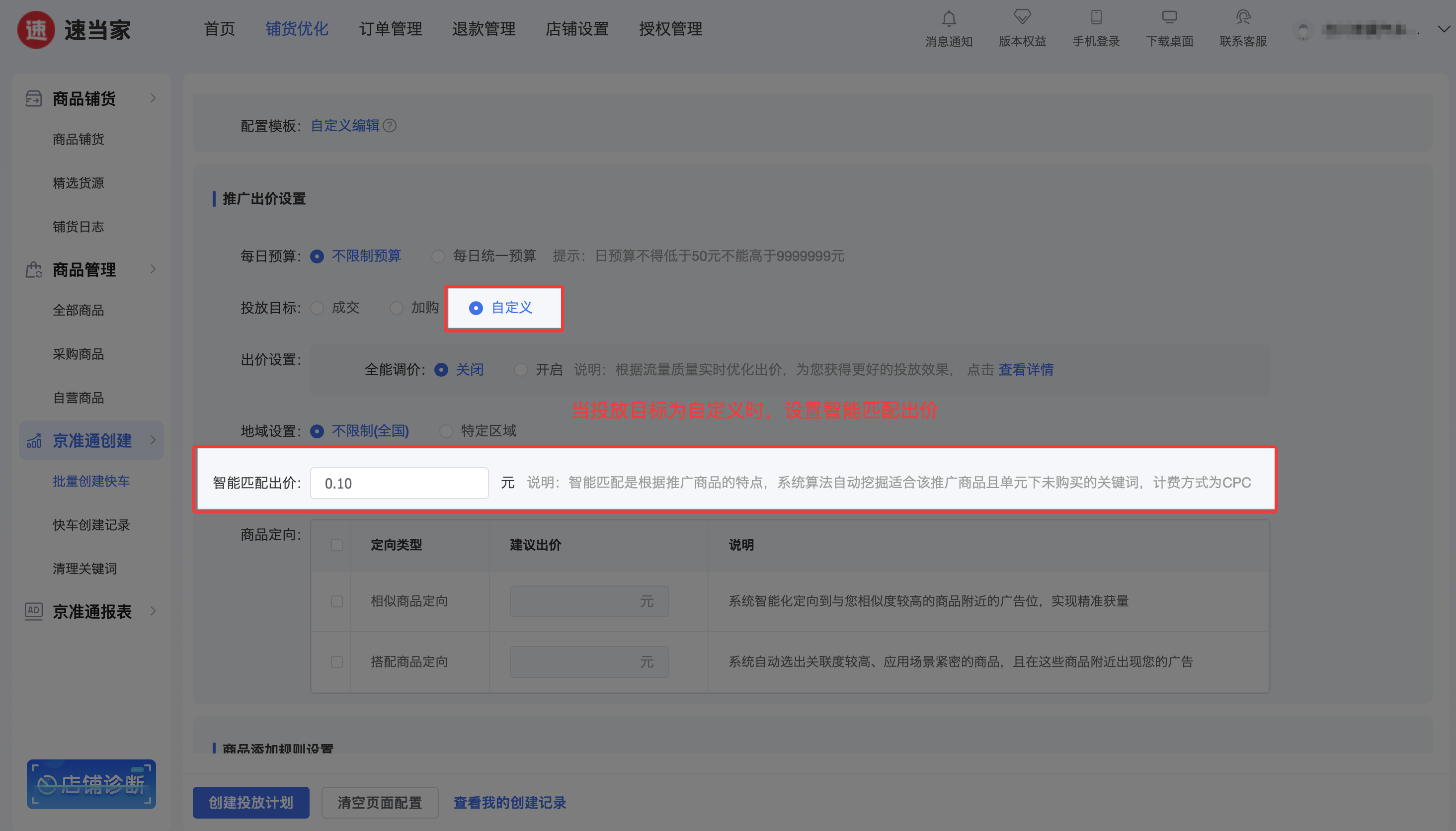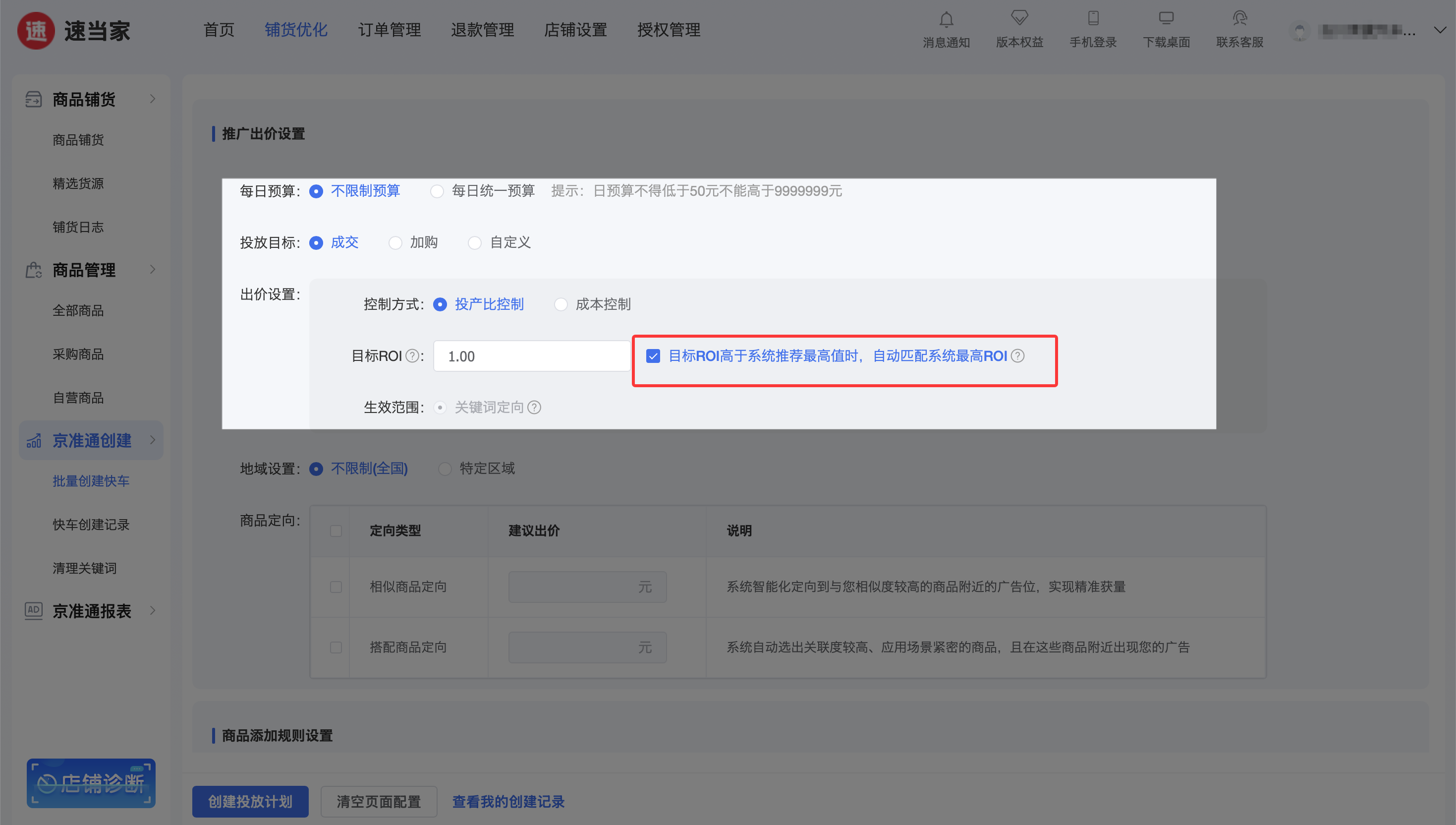 在速当家批量开车,不管投放目标是ROI还是成交成本、加购成本,都有一个“自动匹配系统最佳出价”的选项。当你的出价低于系统最低价或ROI高于系统最高值时,速当家自动匹配后台系统推荐的最优参数。既保证计划创建成功率,又能锁定最低投放成本。