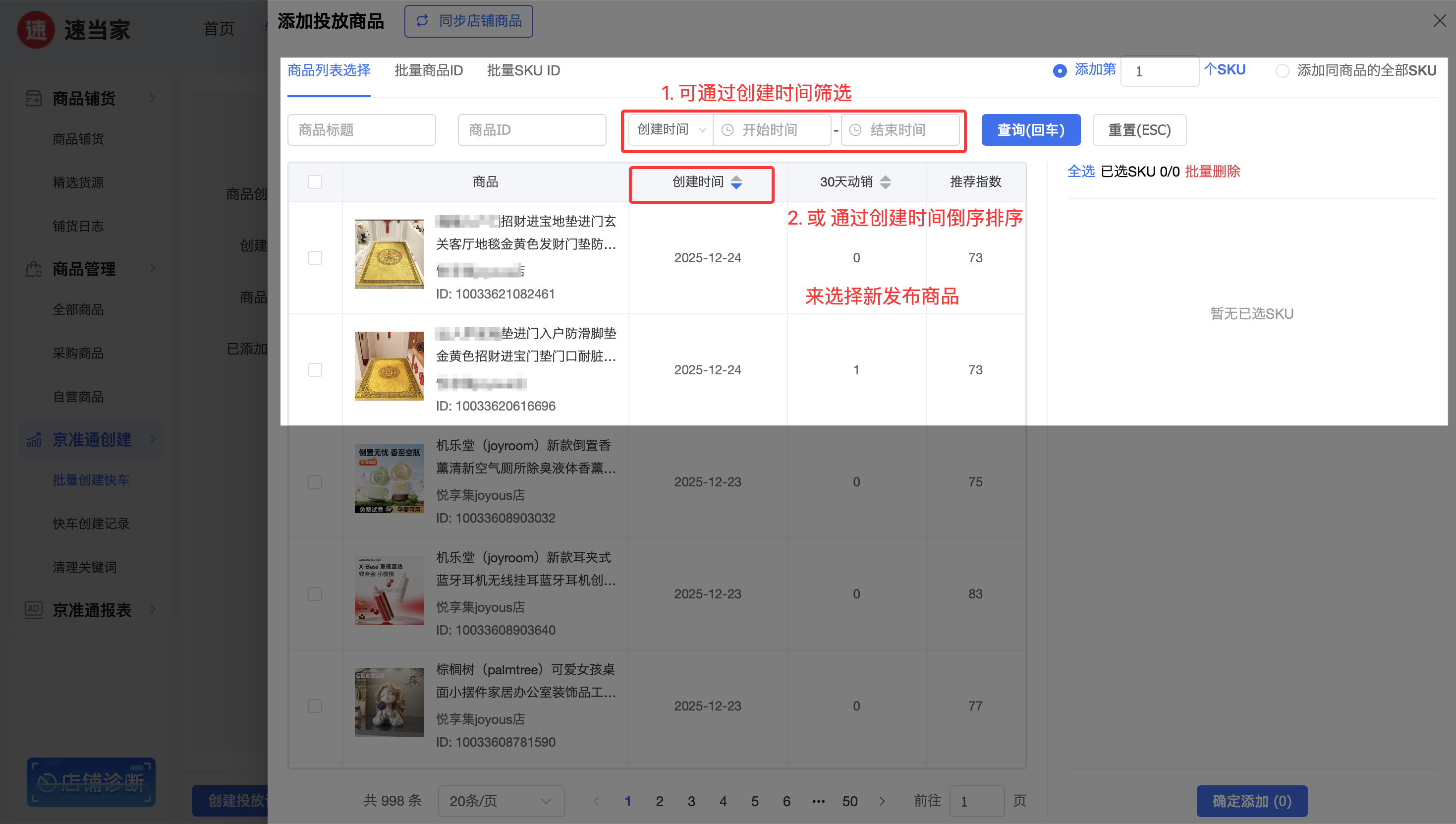 速当家支持批量选品、全店商品开车,建议通过商品的上架时间倒序排列选择最近上新的商品;