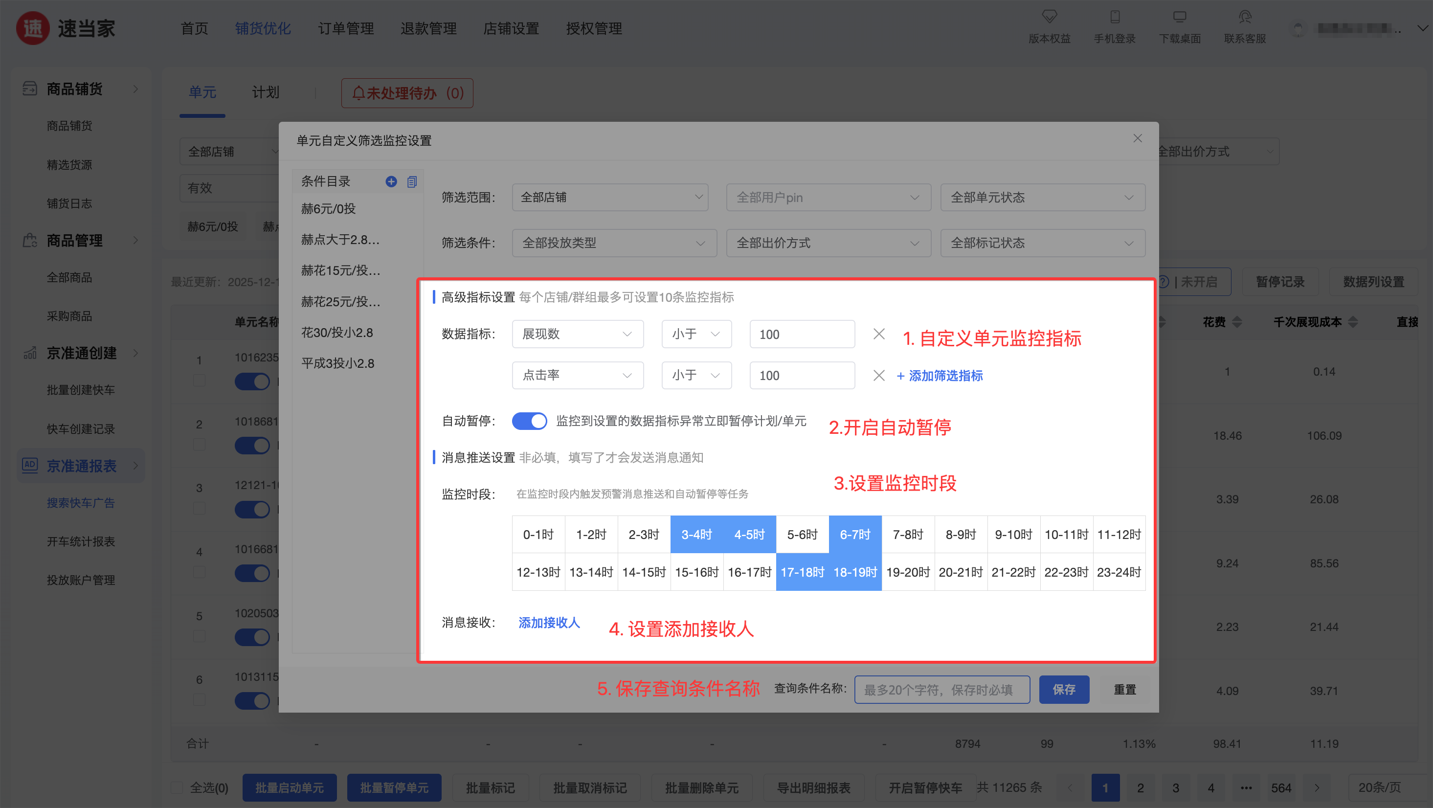在速当家可以自定义单元监控指标,针对花费、点击成本、订单数、ROI等条件设定,未满足商家预期的单元,及时关停,避免被无效放大,有效节省开车的整体支出。(仅限专业版和尊享版用户)