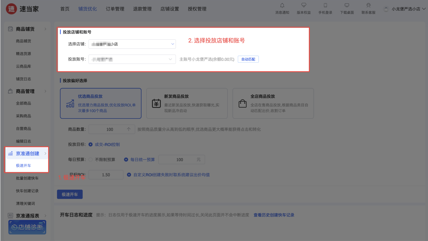 选择店铺后,系统自动匹配有可用余额的投放账号,没有匹配成功默认使用主账号作为投放账号,并支持手工进行选择账号。