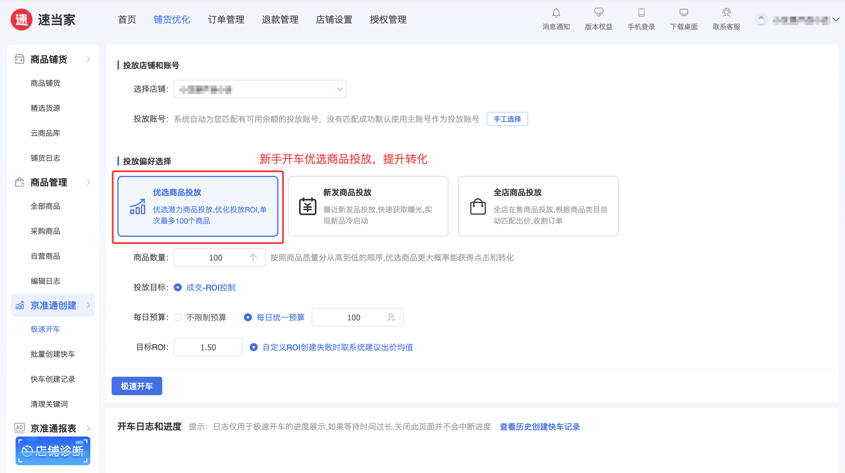 - 冲爆款:选「优选商品投放」,系统根据商品基础权重自动锁定潜力款,单次最多100个商品。