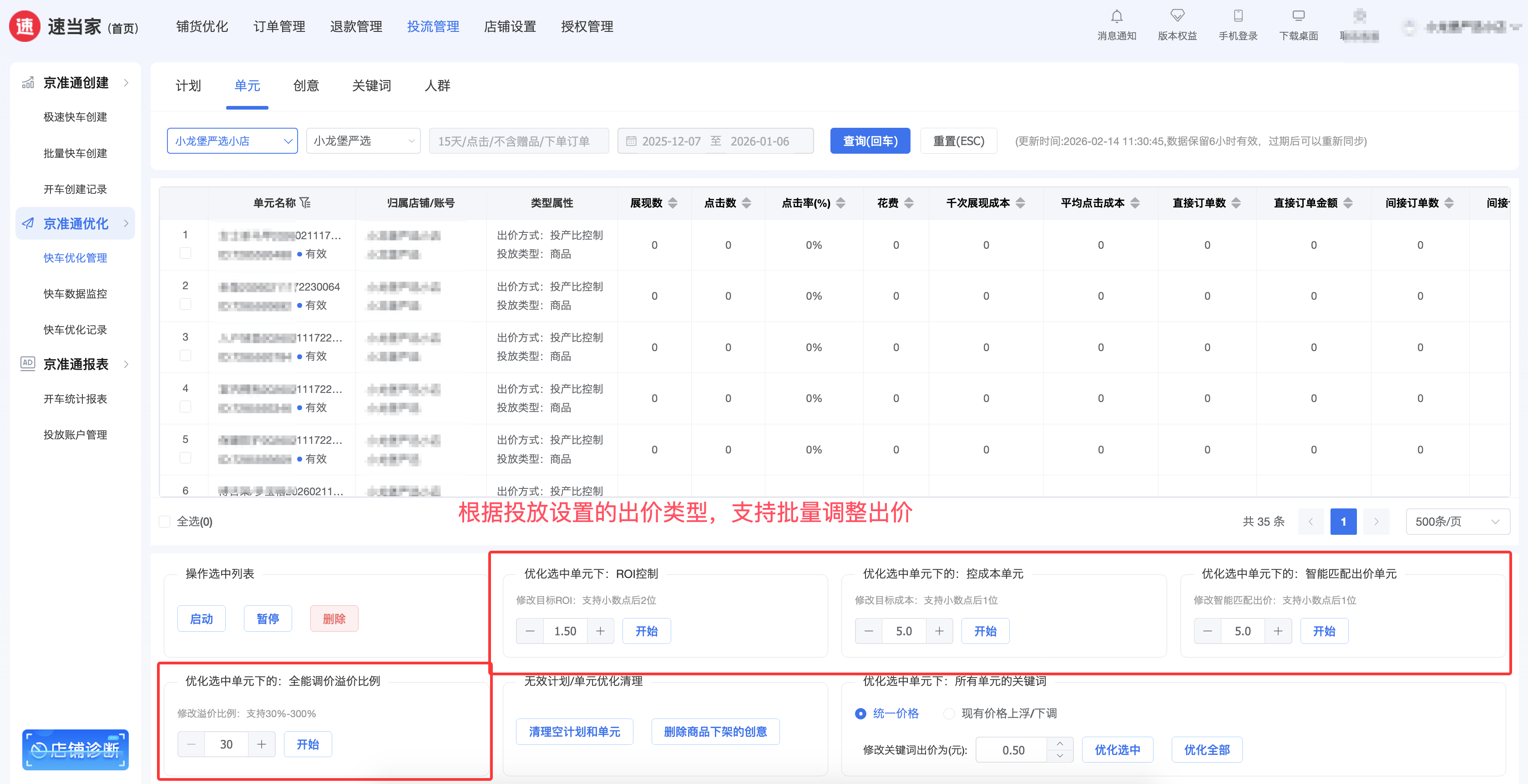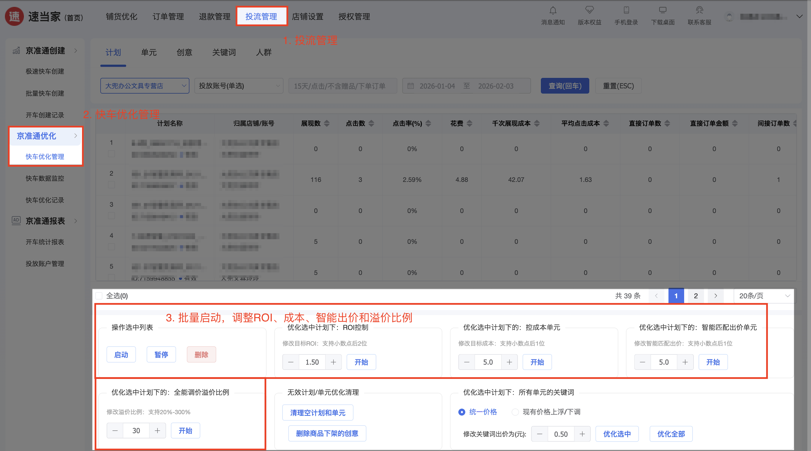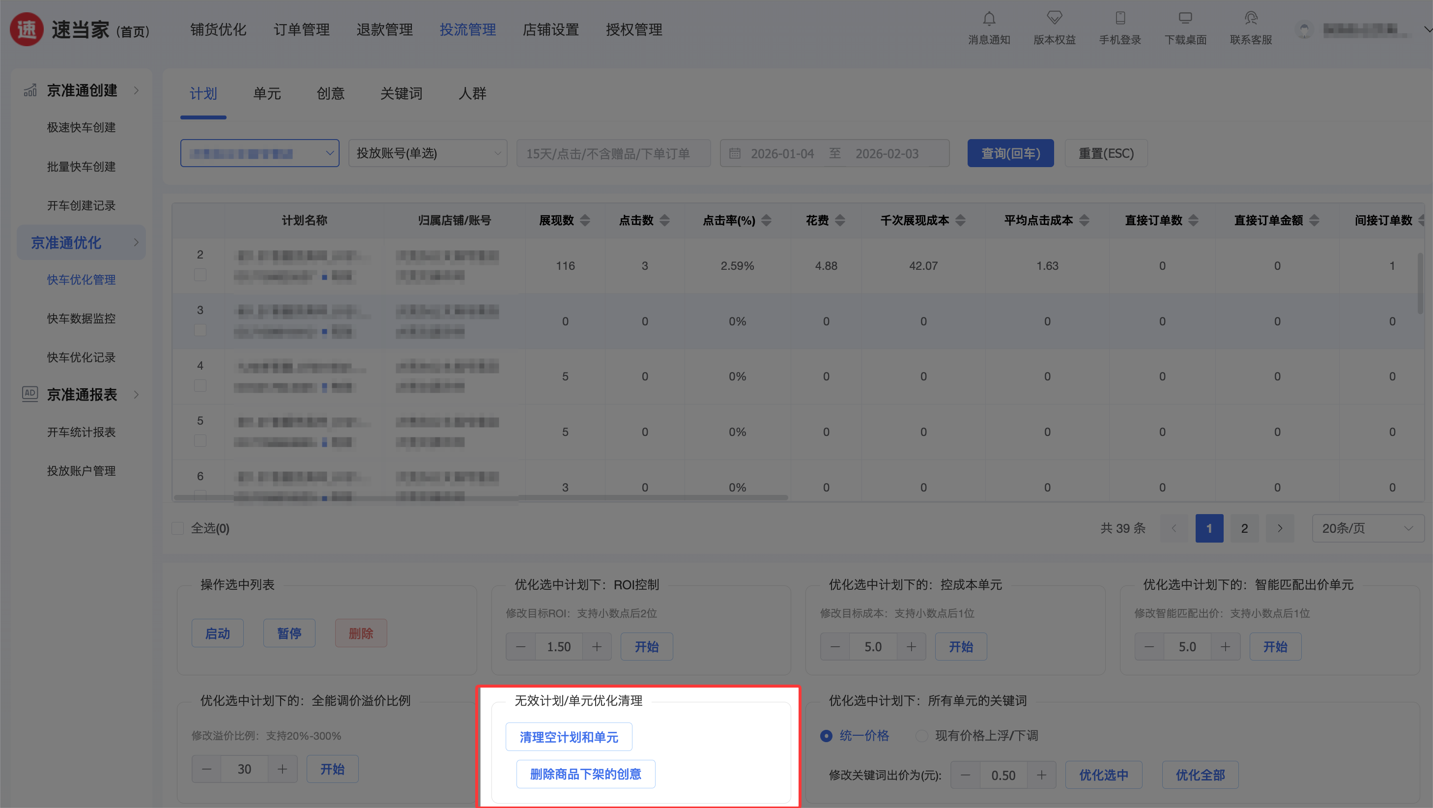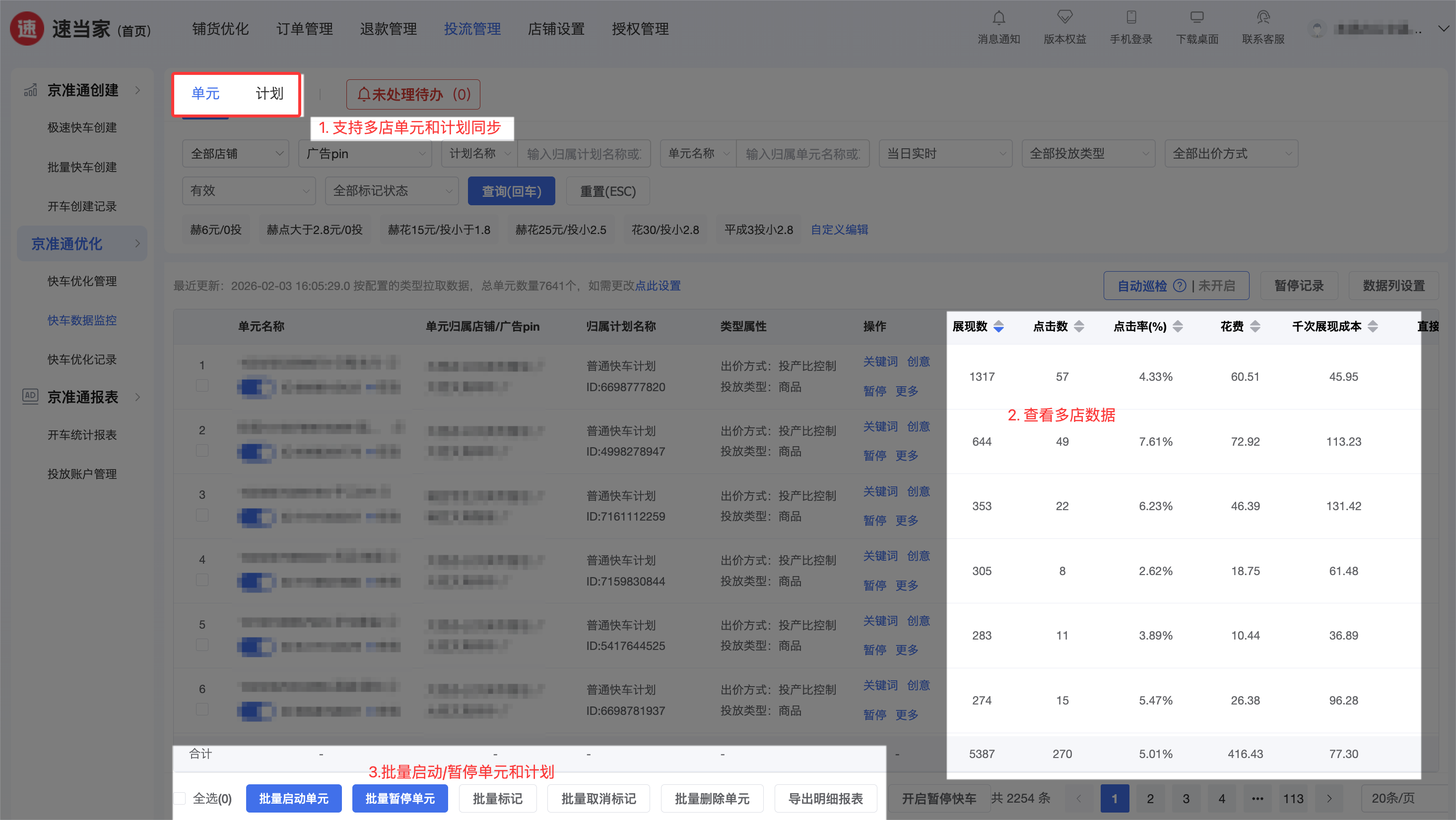 快车批量管理:实时同步京准通后台数据,支持批量启动 / 暂停 / 删除计划、单元,可以一键完成重新启动,10 分钟完成过去 1 天的工作量。