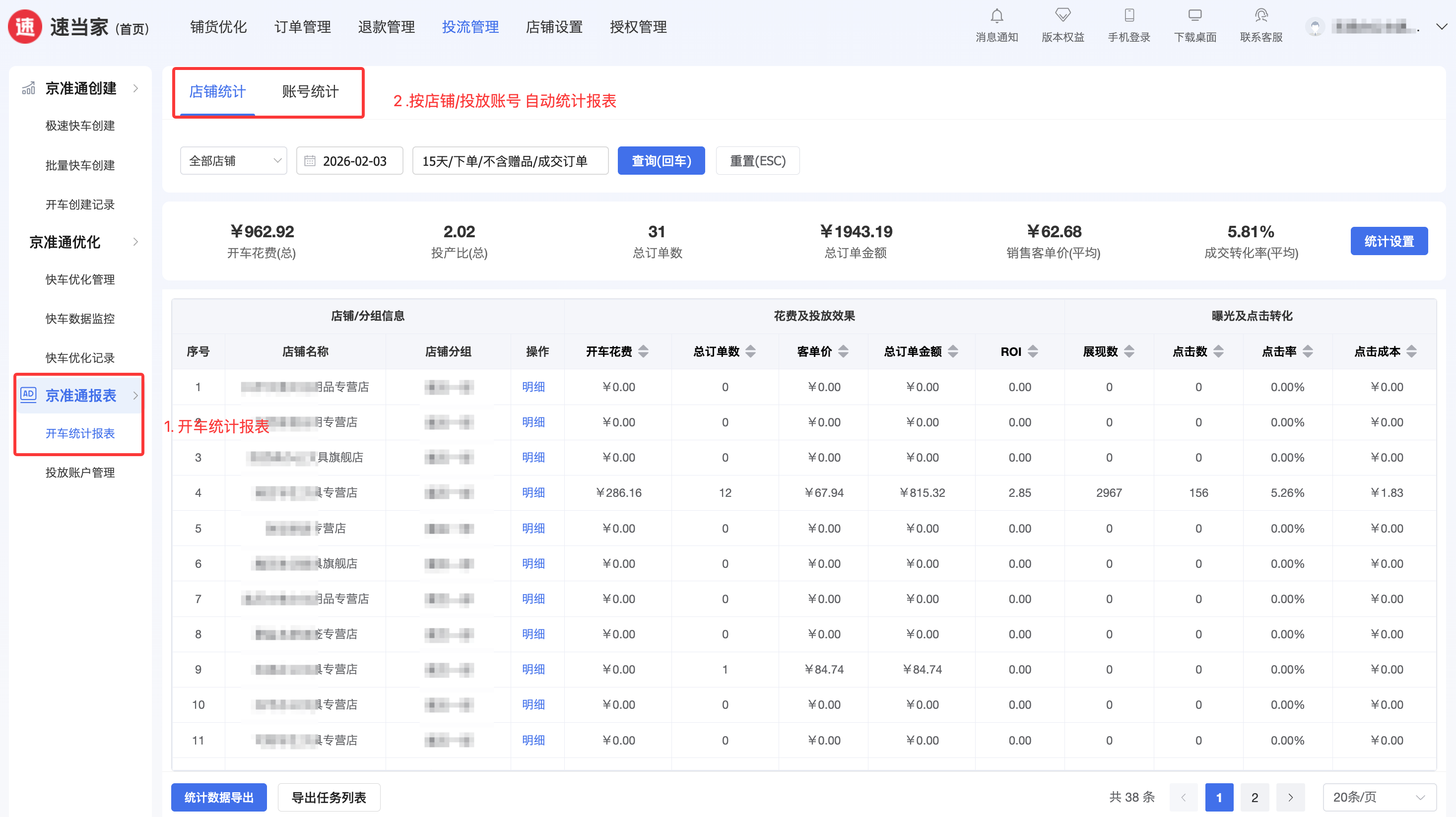 一站式汇总多店、多账号的快车投放核心数据,支持按店铺、账号分组、时间周期筛选,方便对比不同店铺 / 账号的投放表现,优化投放计划。