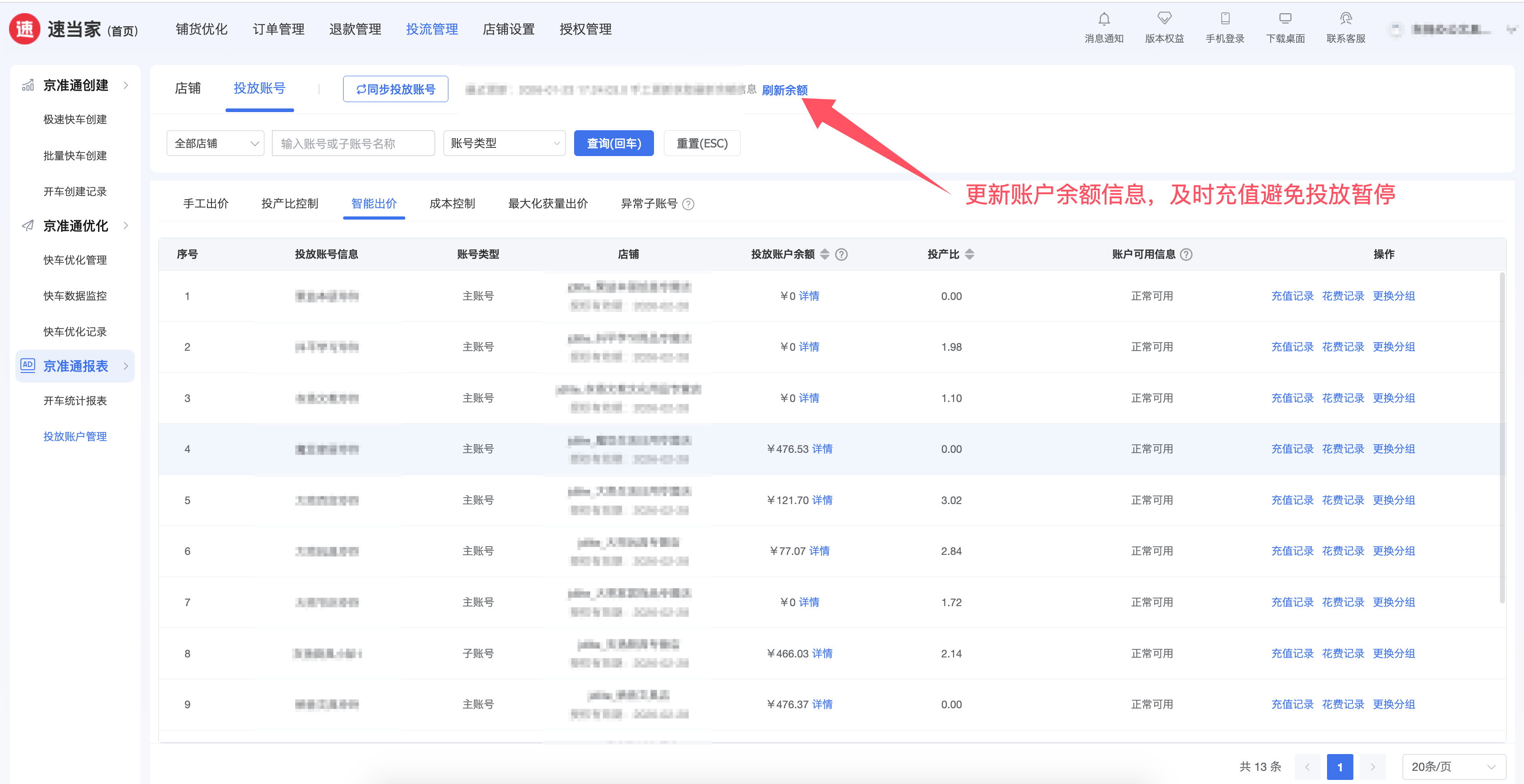 商家如果是多店铺/多投放账户的情况,也可以通过速当家投放账户管理,一键同步后,查看店铺的通用投放余额,投放账户的分配金额(用于投放),及时关注避免余额不足导致投放失效。
