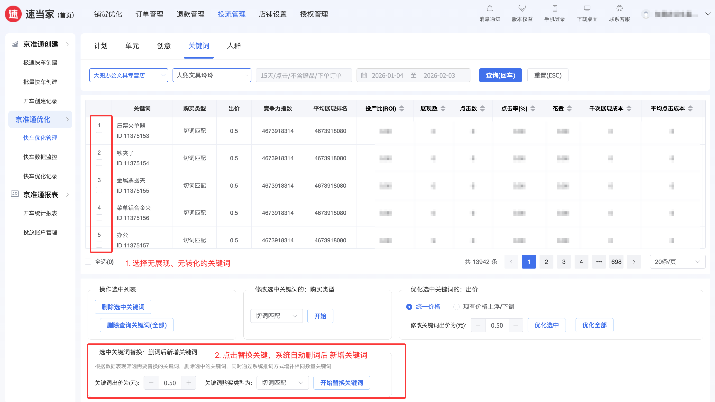 关键词智能优化:勾选低效关键词,系统自动删词+补词,持续优化词库质量,让流量更精准。