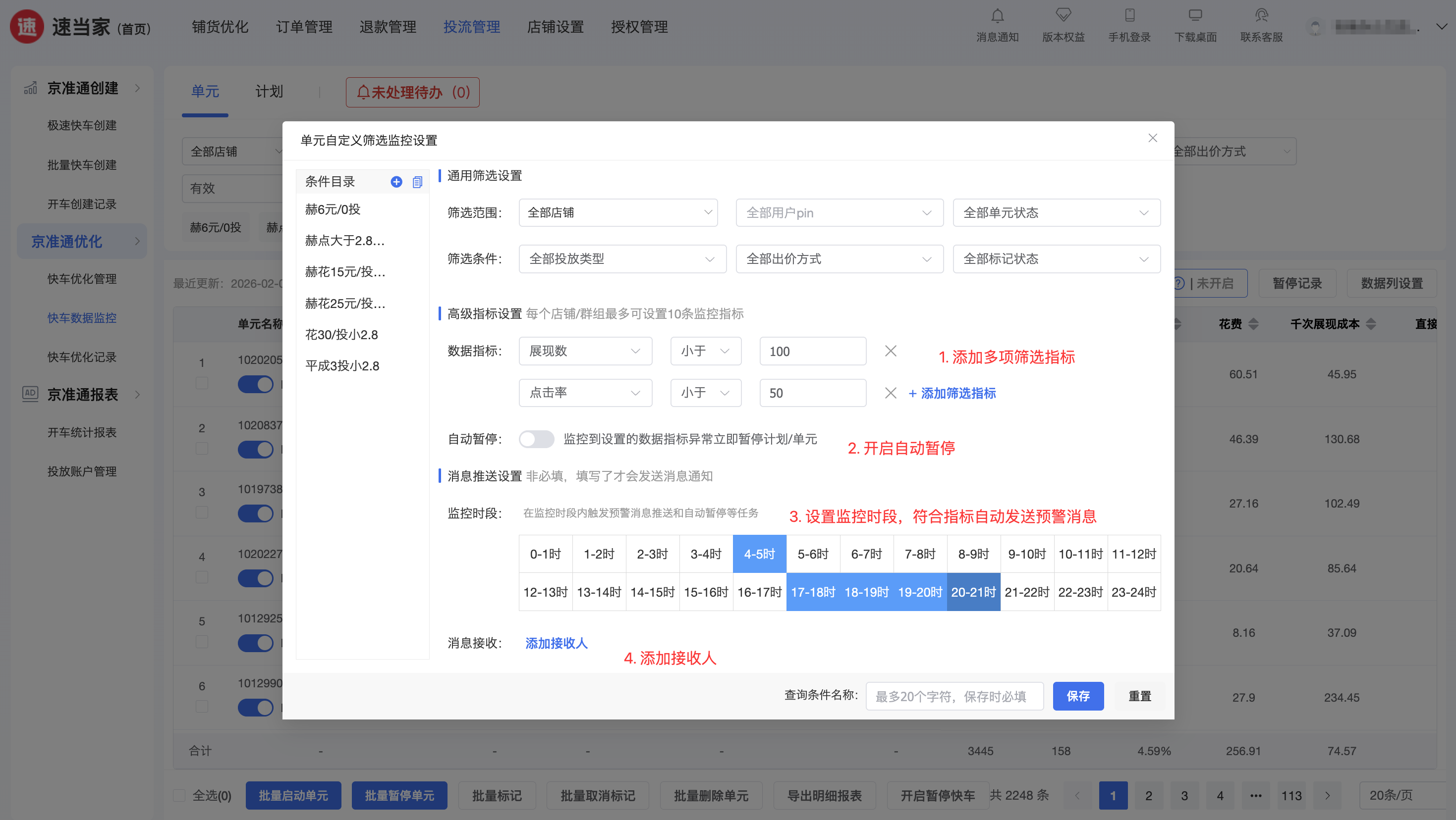托管监控,智能止损:自定义单元监控指标,系统托管监控:一旦识别低效单元、超支预算,自动暂停并及时通知运营——不用熬夜盯数据,也能守住预算底线。
