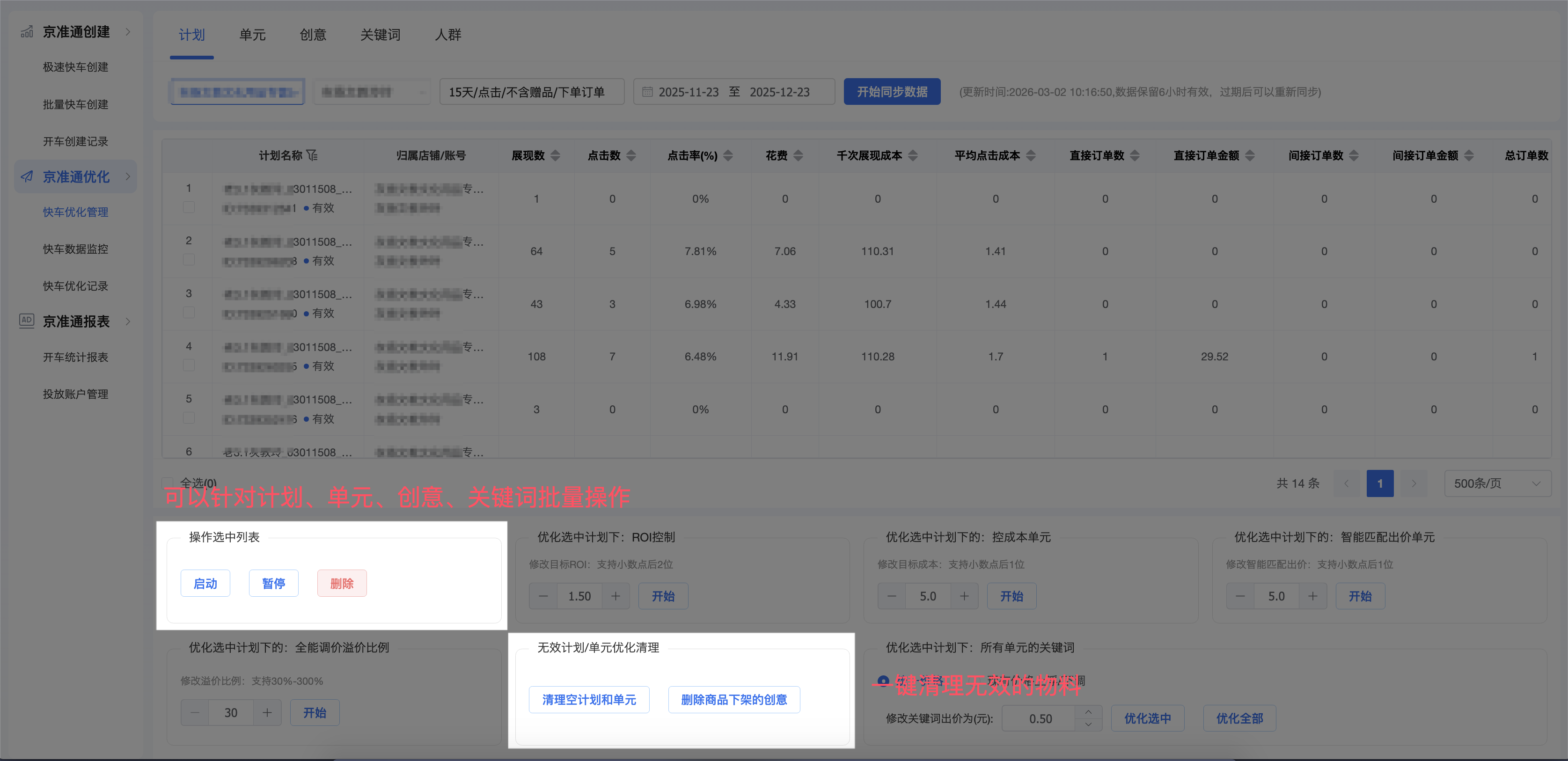 (1)批量暂停/批量删除:投放一段时间以后的计划和单元,如果没有任何数据表现,可以尝试重新开车