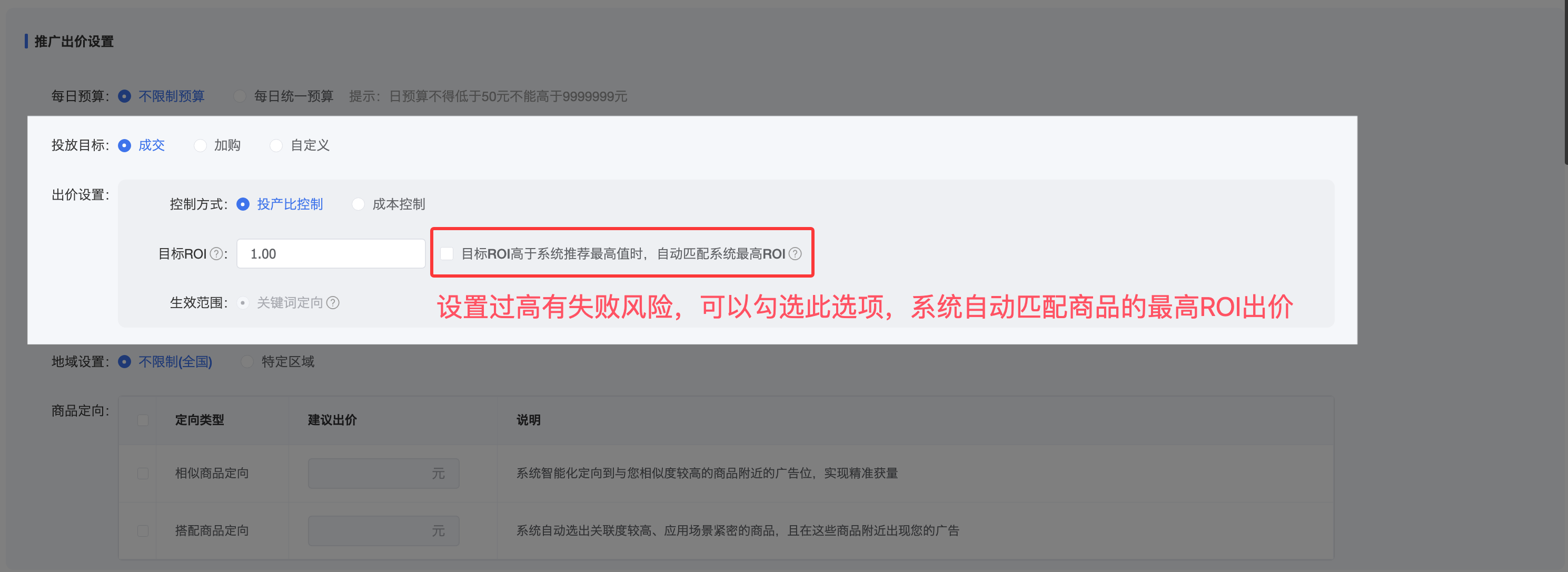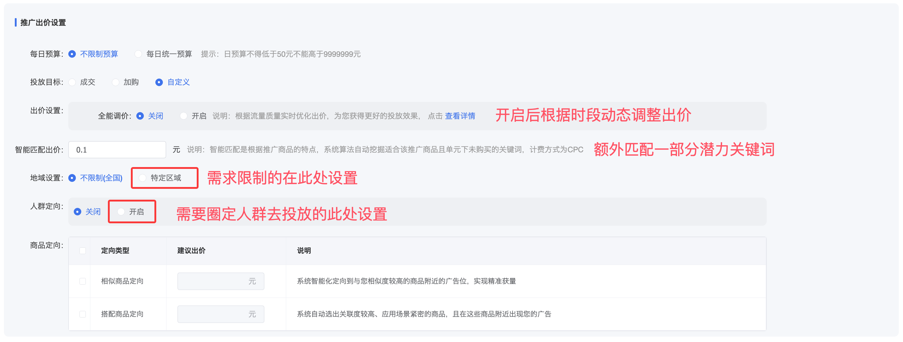 自定义的情况就是平台按照关键词的出价来匹配并分配流量,这时候关键词的出价就非常重要,出价设置支持在0.1~9999区间自定义,系统默认取0.5(实测千次曝光和单次点击成本),可以根据需要进行调整,这部分仅针对投放目标是“自定义”的商家生效,另外如果您投放的商品针对某些区域投放可以设置区域定向,针对某些人群投放可以设置人群定向。